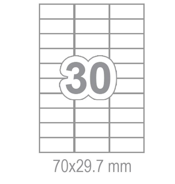 Самозалепващи етикети 70x29.7 30 бр. са произведени от самозалепваща хартия за многофункционална употреба. Подходящи са за работа с копирни машини, лазерни и мастиленоструйни принтери.