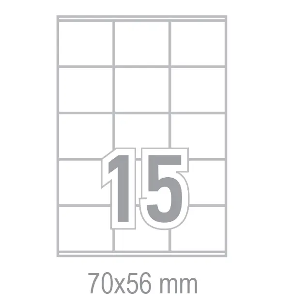 Самозалепващи етикети 70x56 15 бр. са произведени от самозалепваща хартия за многофункционална употреба. Подходящи са за работа с копирни машини, лазерни и мастиленоструйни принтери.