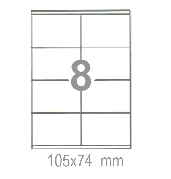 Самозалепващи етикети 105х74 8 бр. са произведени от самозалепваща хартия за многофункционална употреба. Подходящи са за работа с копирни машини, лазерни и мастиленоструйни принтери.