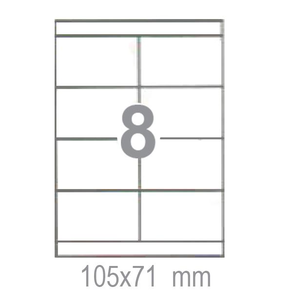 Самозалепващи етикети 105х71 8 бр. са произведени от самозалепваща хартия за многофункционална употреба. Подходящи са за работа с копирни машини, лазерни и мастиленоструйни принтери.