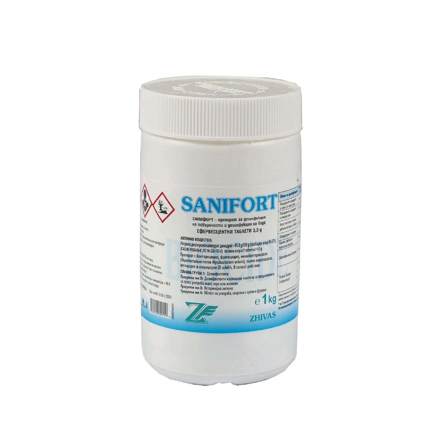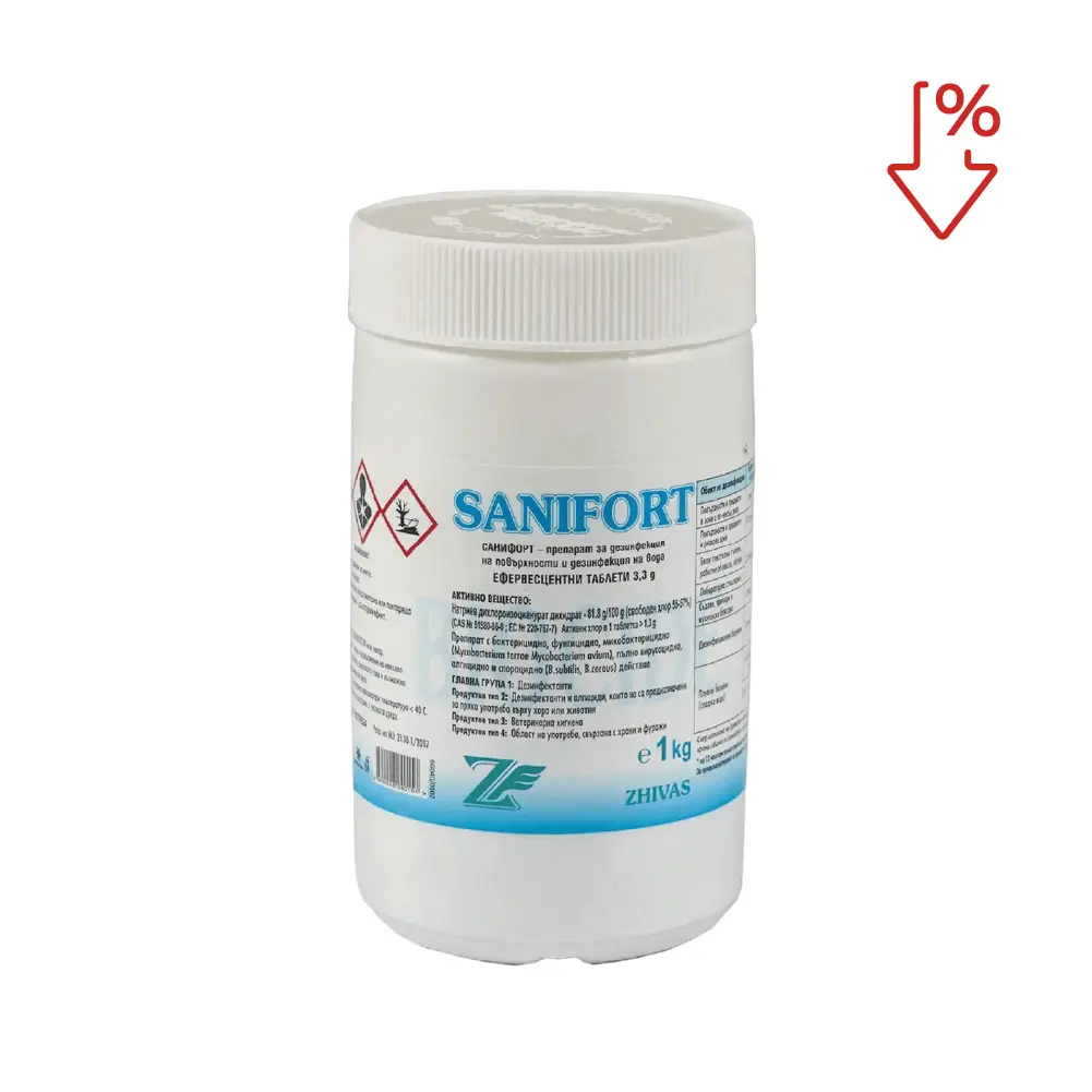 Таблетките за дезинфекция Санифорт 1 кг са надеждният избор за дезинфекция на плувни басейни, предприятия, медицински учреждения, санитарно оборудване и текстил. Препаратът Санифорт е изключително ефективен при много ниски концентрации препарат с бактерицидно, микобактерицидно (вкл. туберкулоцидно), вирусоцидно, фунгицидно, алгицидно и спороцидно действие. Съдържащият се в таблетките натриев дихлоризоцианурат притежава мощно гермицидно действие върху вегетативните форми на грам-положителните и грам-отрицателните бактерии, гъбички, протозоа, водорасли, вируси и спори. Указания за дозириране може да намерите в приложащата галерия и на гърба на препарата.