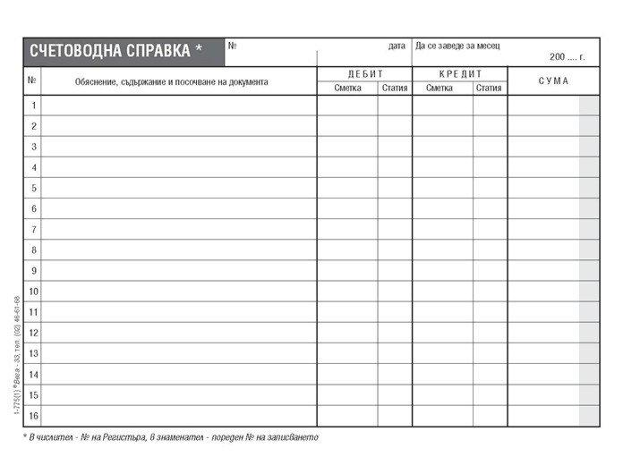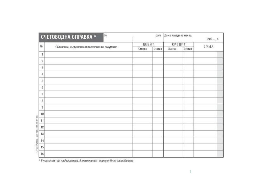 - Документ, с който се описват счетоводни статии, за които няма първичен счетоводен документ, например за преоценката на валута или приключвателните операции