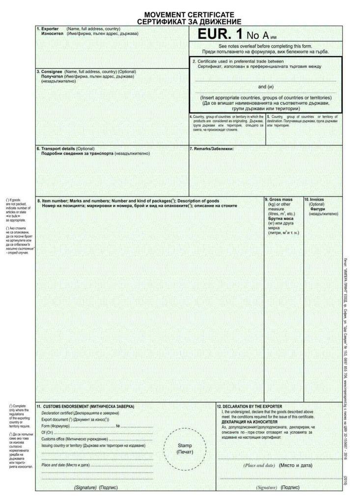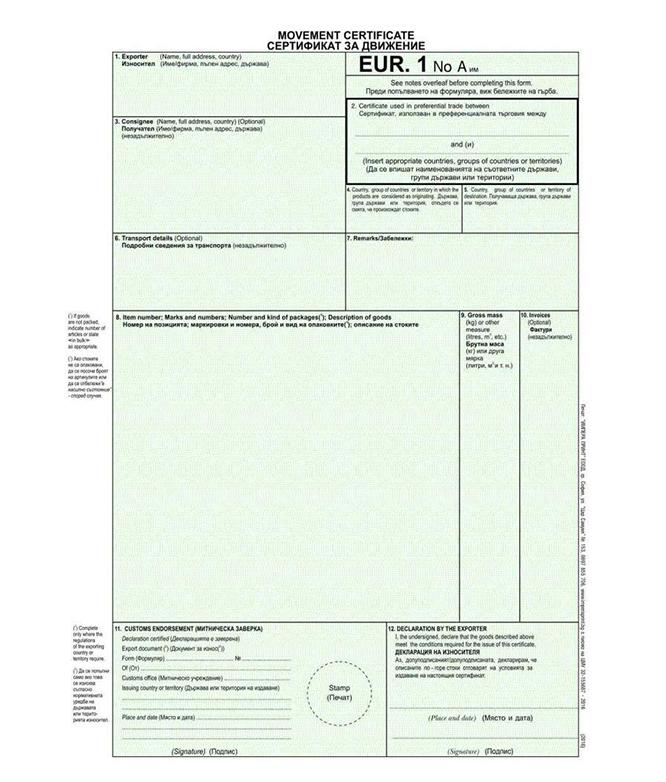 Сертификат Евро 1 2016 офсет
