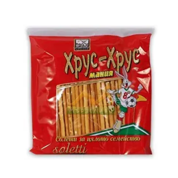 Солети „Хрус-Хрус“ Класик са произведени от: пшенично брашно тип 700, растително масло (палмово), йодирана сол, пресована хлебна мая, емулгатор: слънчогледов лецитин, набухвател, вода. Добре изпечени тестени пръчици с хрупкава структура, поръсени с кристали сол. Любими на цялото семейство!