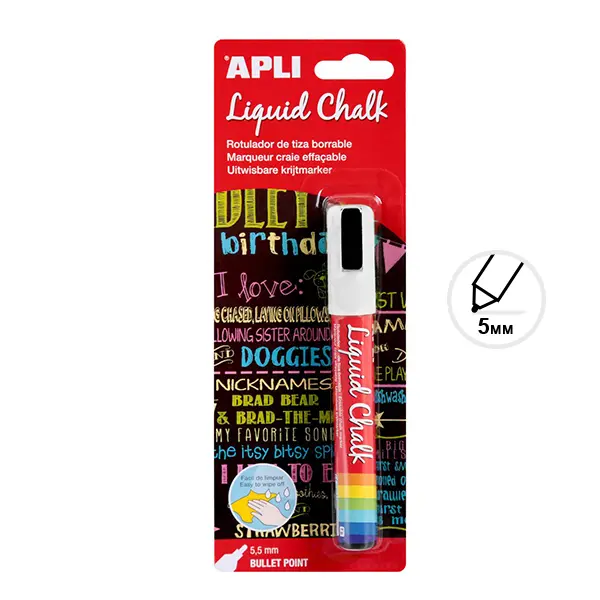 Маркерът тебешир Apli бял е подходящ за писане и рисуване върху стъкло, черна и бяла дъска, декорация на витрини и прозорци. Почиства се изключително лесно и бързо само с помощта на влажна кърпа.