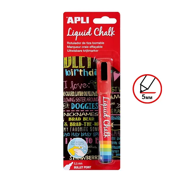 Маркерът тебешир Apli червен е подходящ за писане и рисуване върху стъкло, черна и бяла дъска, декорация на витрини и прозорци. Почиства се изключително лесно и бързо само с помощта на влажна кърпа.