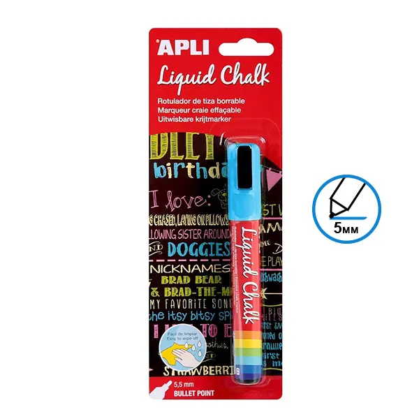 Маркерът тебешир Apli син е подходящ за писане и рисуване върху стъкло, черна и бяла дъска, декорация на витрини и прозорци. Почиства се изключително лесно и бързо само с помощта на влажна кърпа.