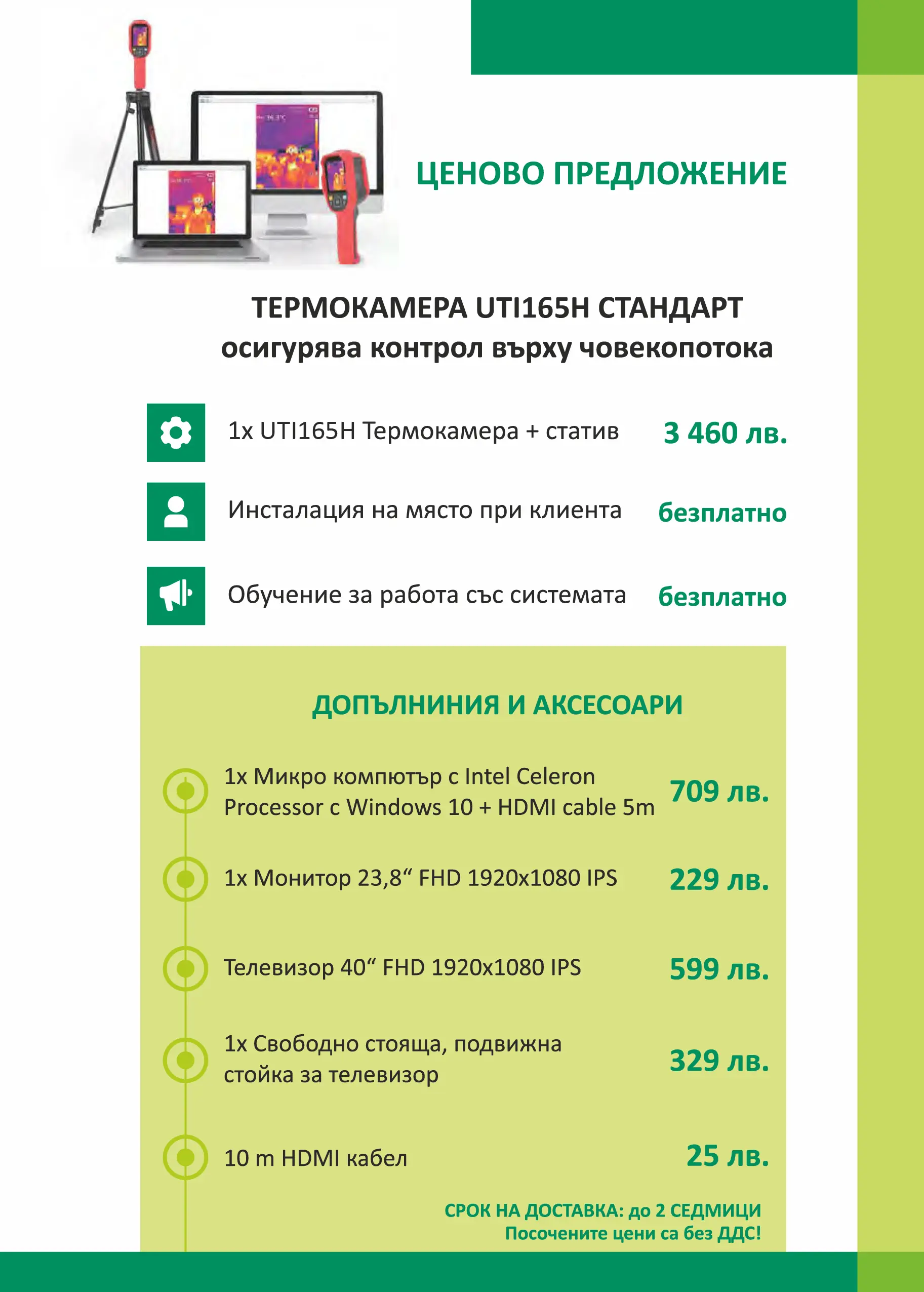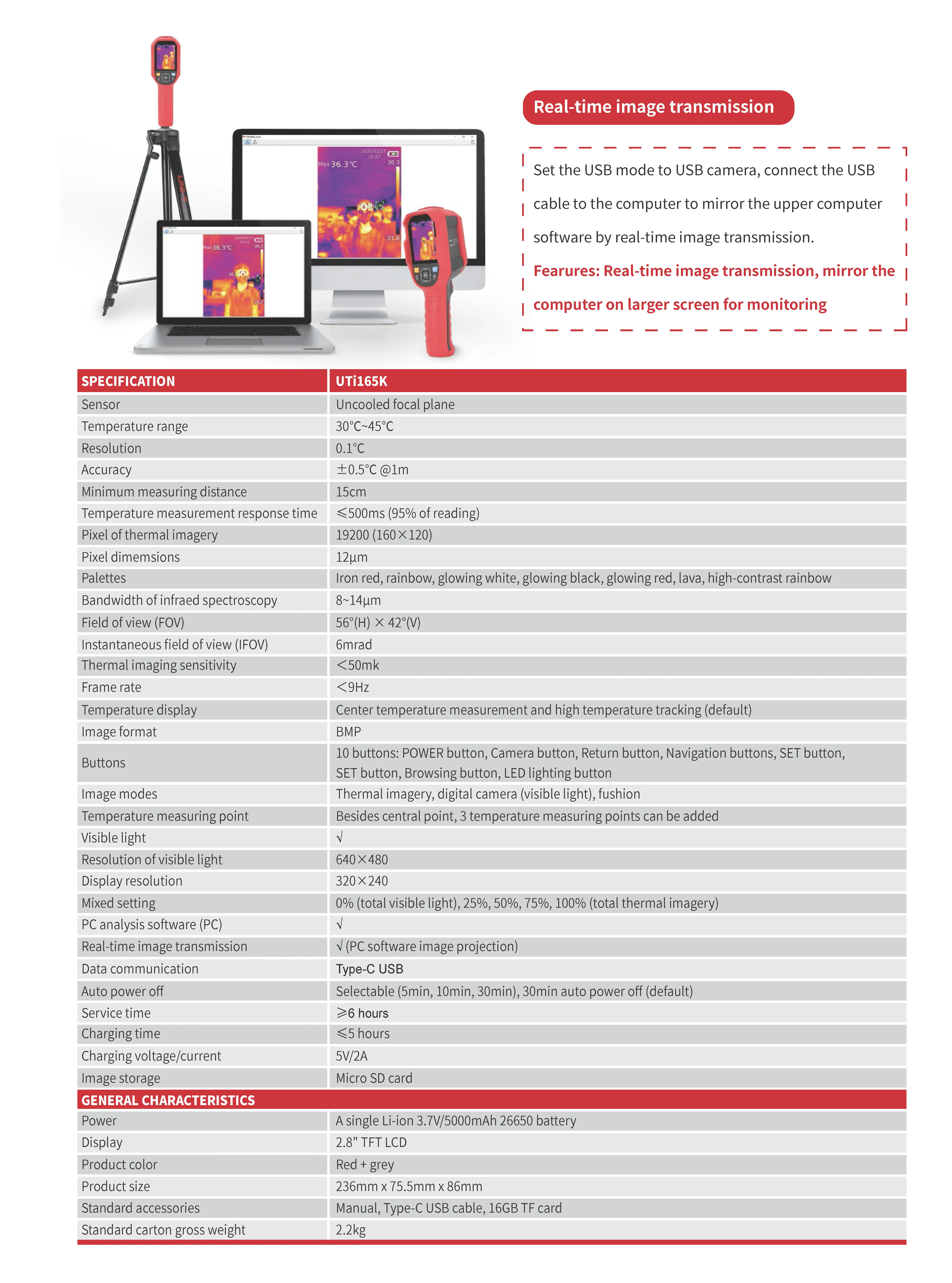 Термокамерата UTI165K стандарт е иновативно решение за мониторинг на телесната температура, което позволява намирането на лицата с повишена температура, които са потенциални носители на вируси. Технологията комбинира термокамера с точково измерване и устройство за анализ на получените данни. Също така термокамерата е снабдена с функцията за трансфер на снимкови данни в реално време и тяхното съхранение на SD карти. Термокамерата UTI165K има пригоден отвор за монтиране на триножник 1/4", което я прави изключително практична за употреба на летища, ЖП гари, метростанции, болници, училища, детски градини, банки, предприятия, корпоративни офиси и други обществени места и сгради с голям човекопоток.