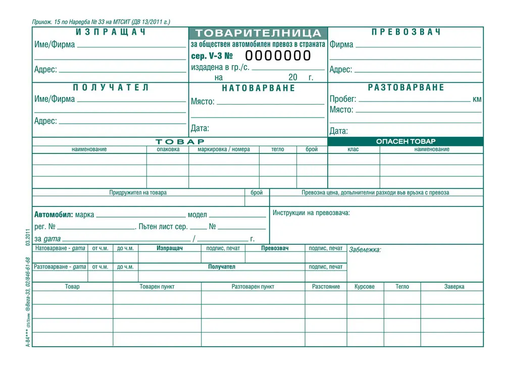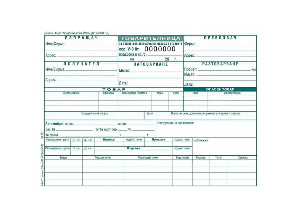 - Товарителница за обществен автомобилен превоз в страната, с индивидуален номер на всеки три листа