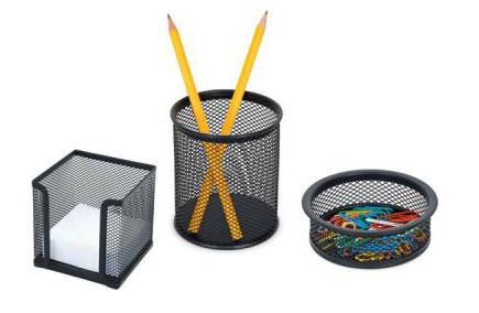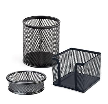 Комплектът от три части мрежа се състои от поставка за кламери, кубче за листчета и моливник. Подходящ е за всяко бюро, тъй като се предлага в два цвята и има съвременен дизайн.