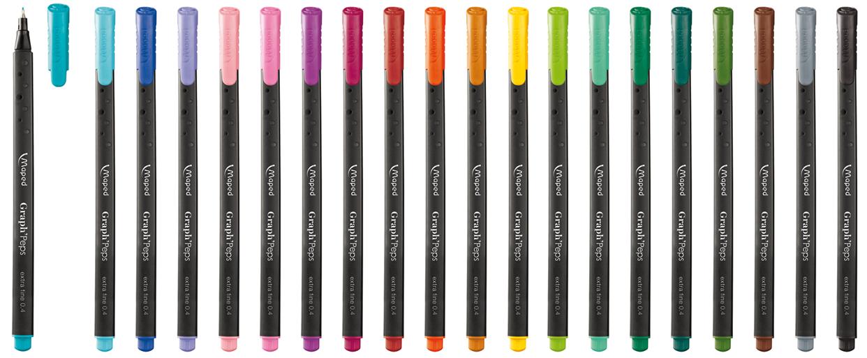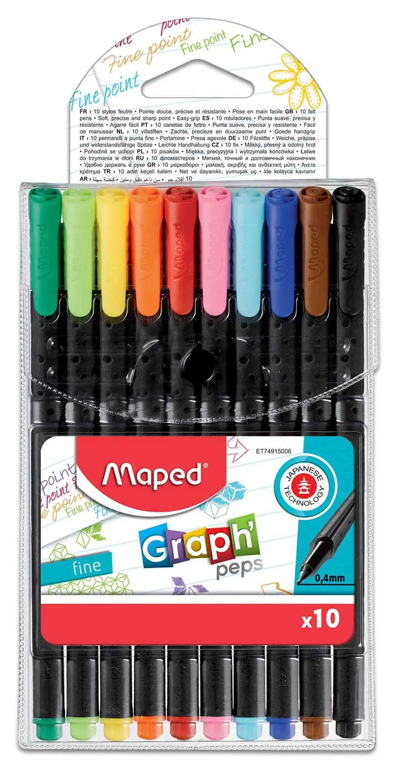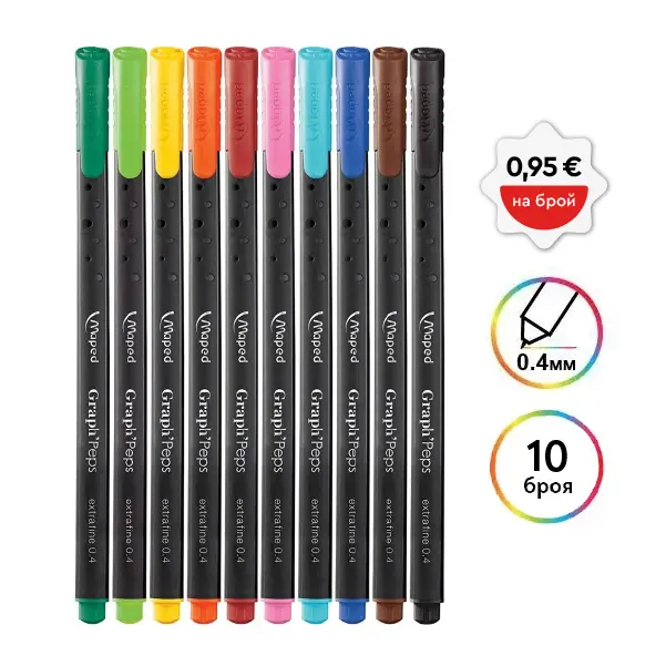 Тънкописец Graph Peps комплект 10 цвята с триъгълна форма на тялото за оптимално сцепление на захвата при писане. С метален 4 мм. връх, плътно тяло, затварящо се с капачка в цвета на писане, подходящ за чертане с шаблон и линия. Идеален за писане и скициране в гладко и равномерно писане.