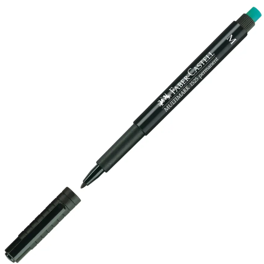 Тънкописец Faber-Castell 1525 OHP М черен има специална гума за корекции и се нанася безпроблемно върху повечето гладки повърхности като стъкло, дърво, метал, камък и картон. Изключително наситен и светлоустойчив цвят с ясен рисунък. Гумата коригира текст от всички гладки повърхности, като CD, DVD, Blu-ray и фолио.