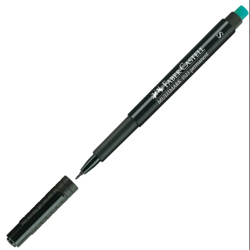 Тънкописец Faber-Castell 1523 OHP S черен е перманентен тънкописец с капачка и вградена гума за корекции върху гладки повърхности. Подходящ е за писане върху гладки повърхности, като стъкло, метал, картон, DVD, Blu-ray и фолио.