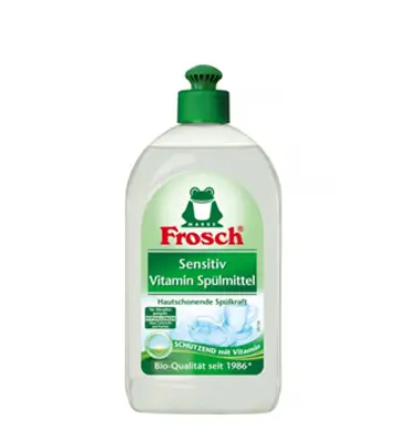 Frosch 500 мл представлява препарат за миене на съдове, който гарантира високa грижа за ръцете и перфектно измити съдове. Продуктът е възможно най-малко агресивен към ръцете и същевременно най-ефективен при измиването на всякакви замърсявания от съдовете.