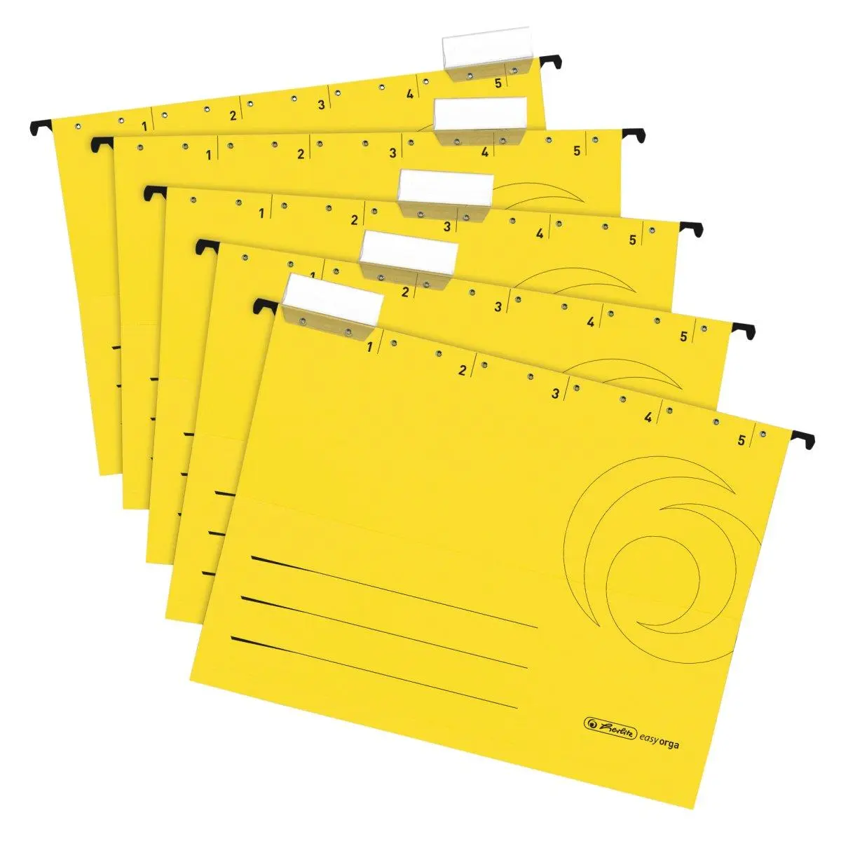 Висящата папка Herlitz V 5 бр е подходяща за подреждане на документи в метални кардекси, боксове и картотеки с цел улесненото намиране на търсената от вас папка с информация. Притежава подвижна табелка за надписване и метални шини за окачване.