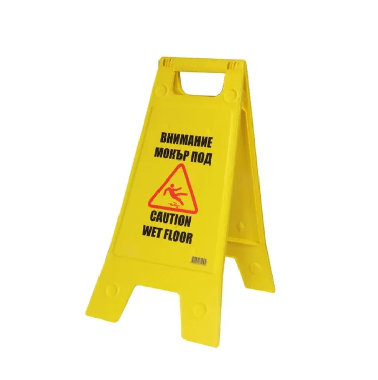 Табелата " Внимание мокър под " е предназначена за предупреждение и предпазване от евентуално подхлъзване след почистване.