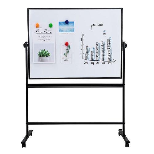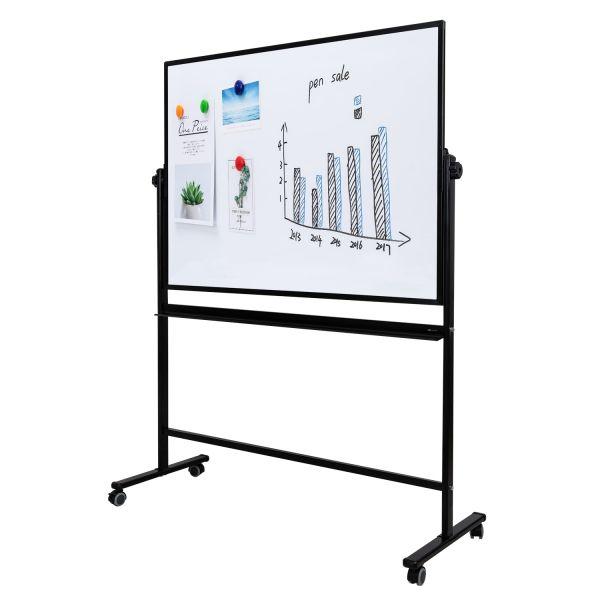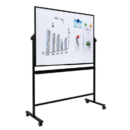 Бяла магнитна дъска 90х120 см мобилна е двустранна дъска с хоризонтално завъртане на работната площ. Черна алуминиева рамка със заключващ механизъм. Метална стойка на колела с блокировка.