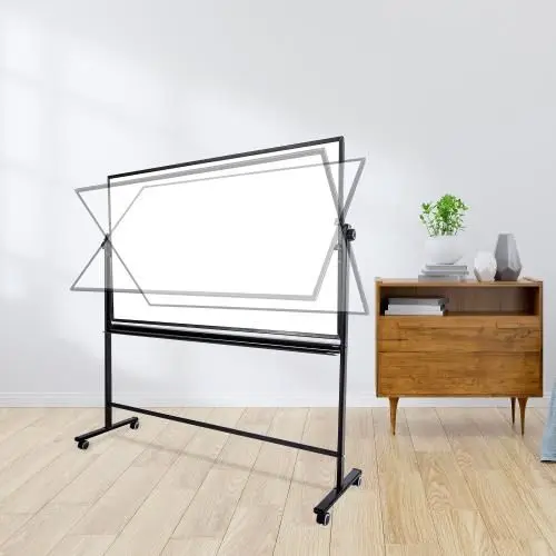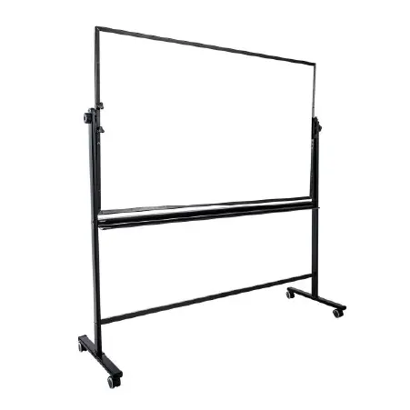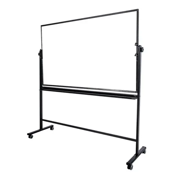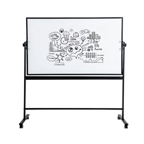 Бяла магнитна дъска 90х150 см мобилна е двустранна дъска с хоризонтално завъртане на работната площ. Черна алуминиева рамка със заключващ механизъм. Метална стойка на колела с блокировка.
