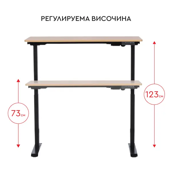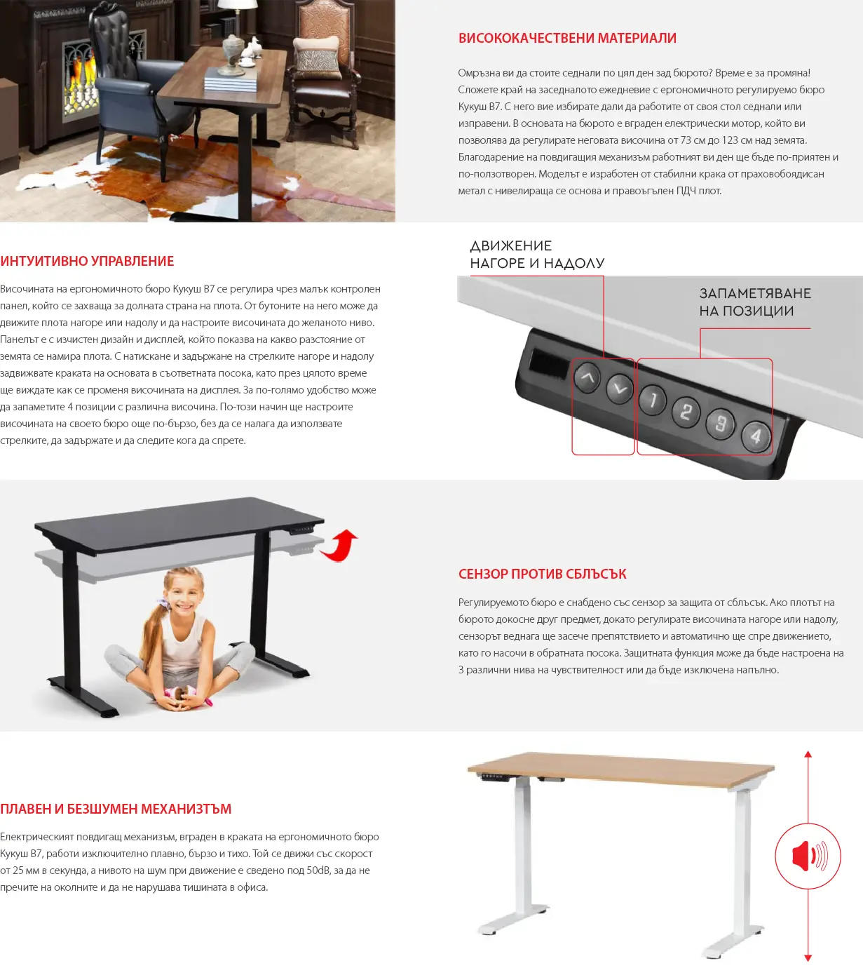 Бюро регулируемо КУКУШ B7 е модел с регулируема височина, което ви позволява да работите изправени, за да се раздвижвате през дългите работни дни. Ергономичното бюро е с електронен панел за управление, чрез който можете да регулирате височината на плота в рамките от 73 до 123 см. От него може да запаметите също 4 различни позиции с различна височина, а за да се избегнат инциденти КУКУШ 02 притежава сензор против сблъсък, който спира движението, ако плотът се допре в друг предмет.