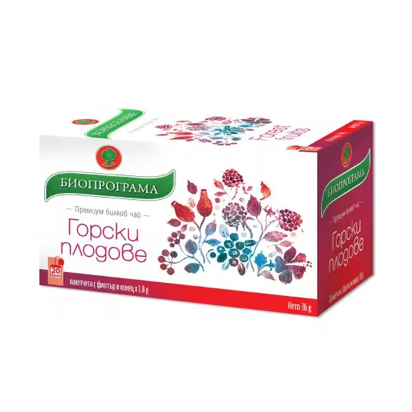 Състав: цвят хибискус, плод шипка, стрък черна боровинка, ароматизант горски плодове, плод арония, плод малина, плод касис, сладък корен