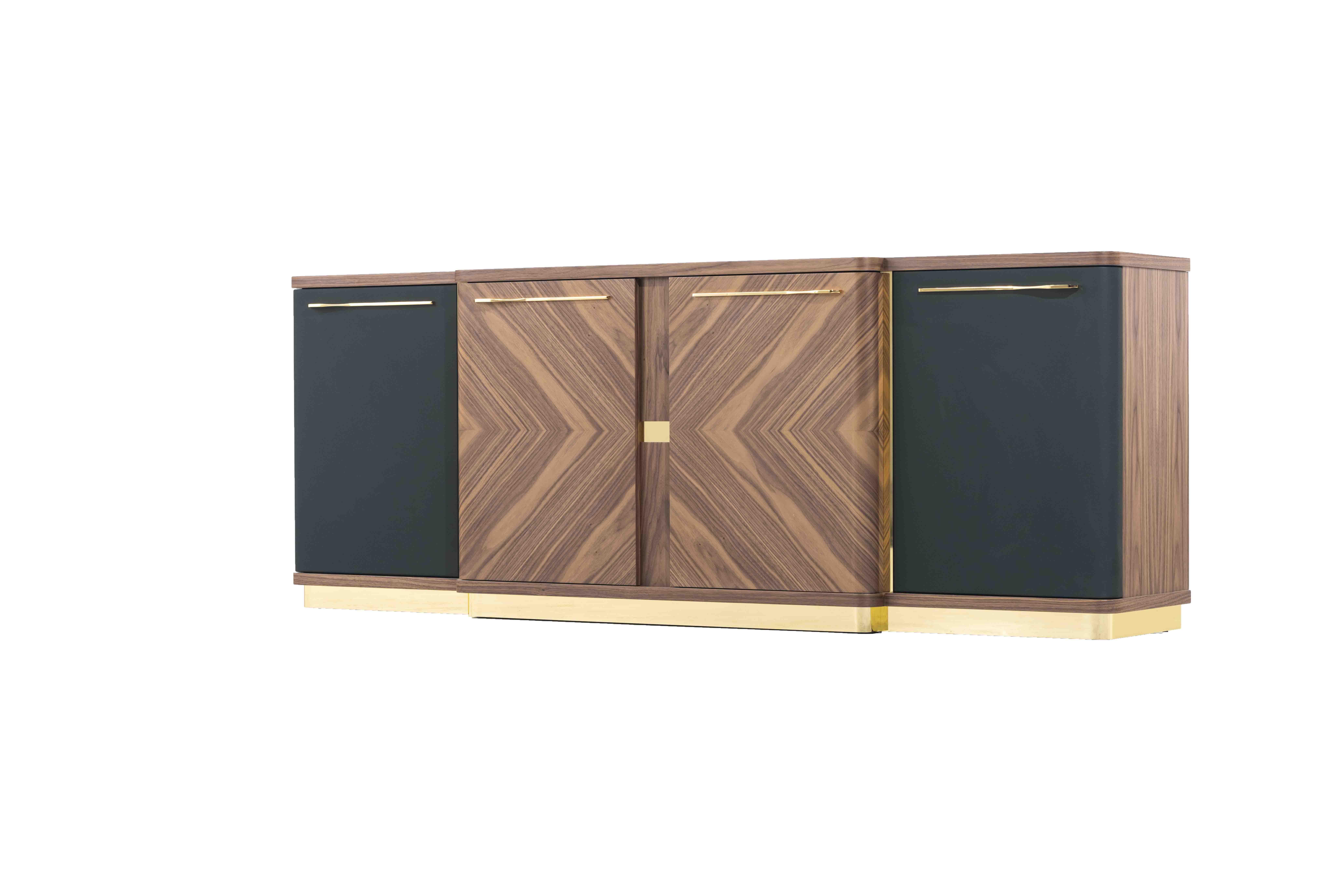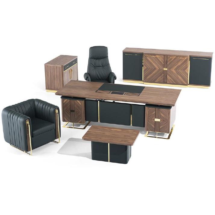 Директорски кабинет ASTORIA е елегантен директорски кабинет, съчетаващ първокласни материали и модерен дизайн. Комплектът включва просторно работно бюро с дървесен финиш и златисти акценти, офис етажерка, масичка за кафе и допълнителен шкаф за съхранение.