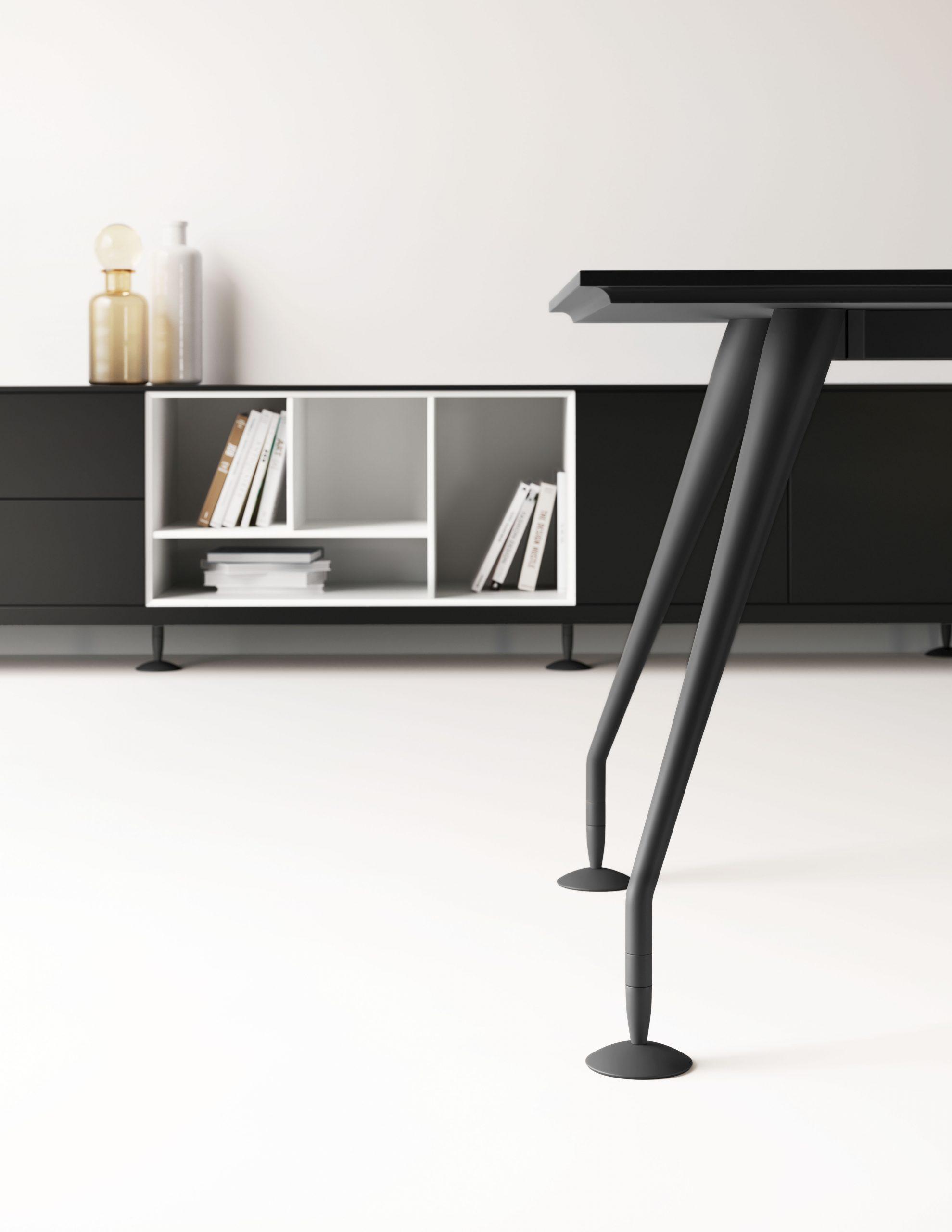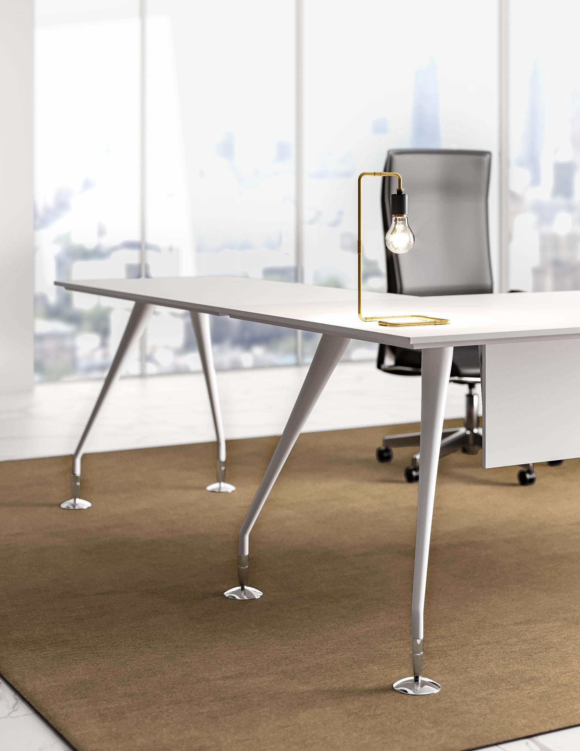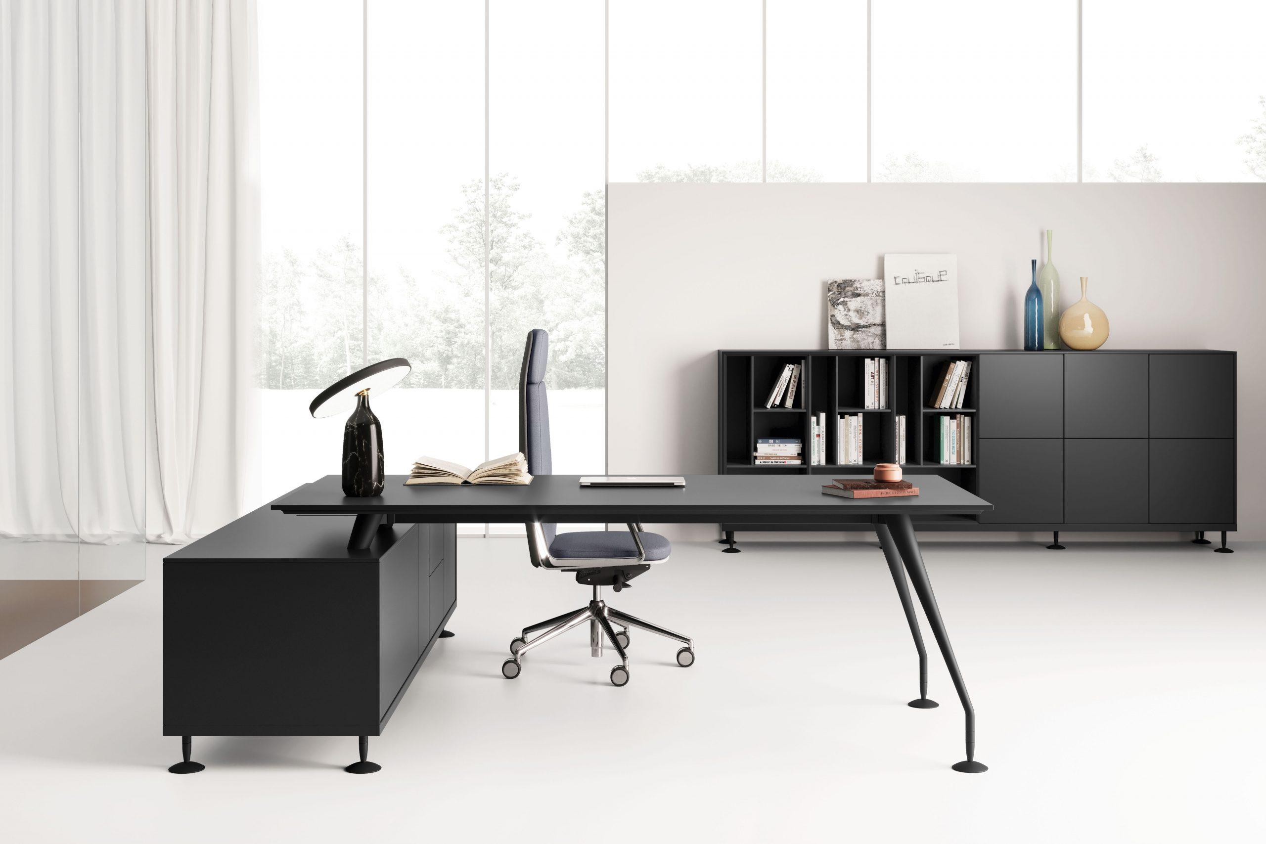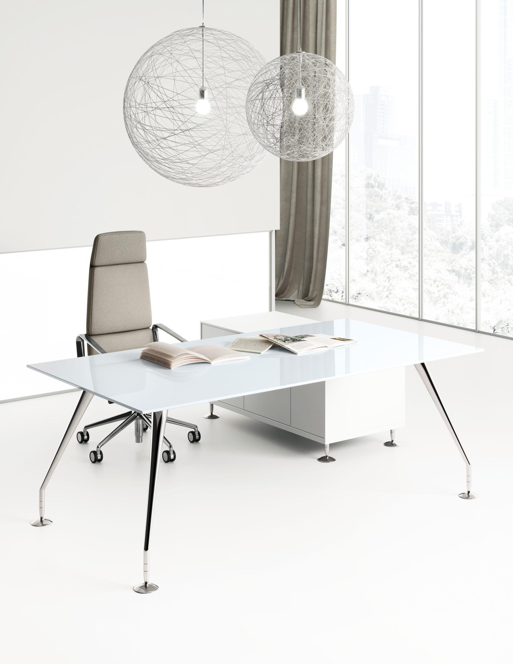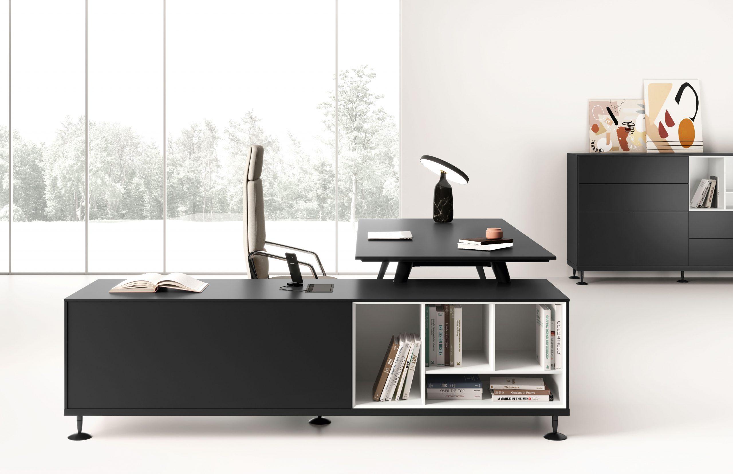 Директорски кабинет ENOSI EVO е вдъхновяващ и елегантен кабинет, състоящ се от маса и помощен модул. Дизайнът на кабинета е дело на италианския дизайнер Nikolas Chachamis, който умело е съчетал нуждата от работно пространство с динамика на формите и повърхностите. Правите и отсечени линии в комбинация от ярки цветове със студени подтонове внасят изящество и стил във всяко офис помещение. Плотът на масата се предлага във вариант, изработен от МДФ с покритие от PVC и такъв със закалено стъкло. Помощният модул образува L-образна структура заедно с масата, като се превръща в незаменим помощник при провеждане на срещи и преговори.