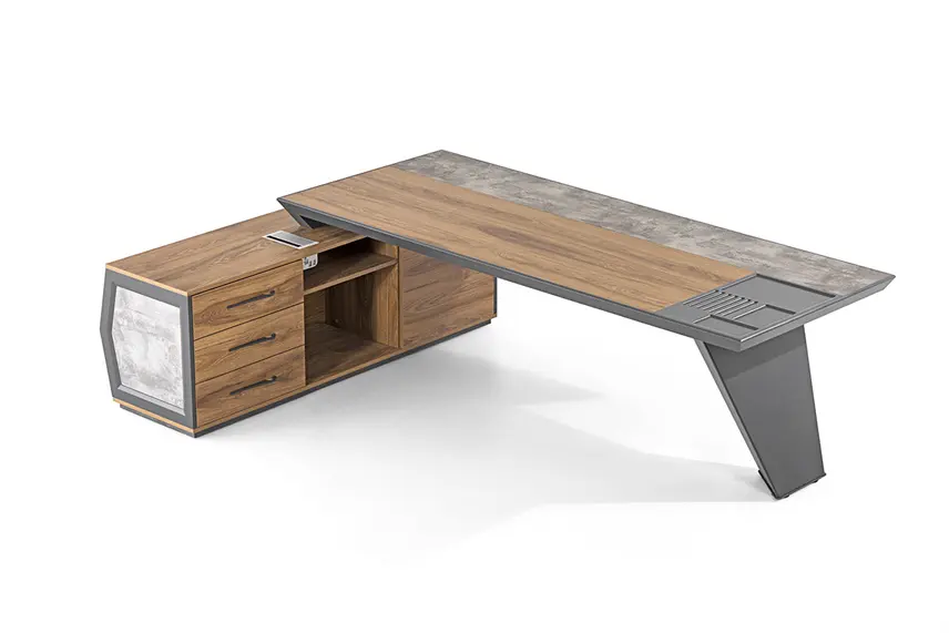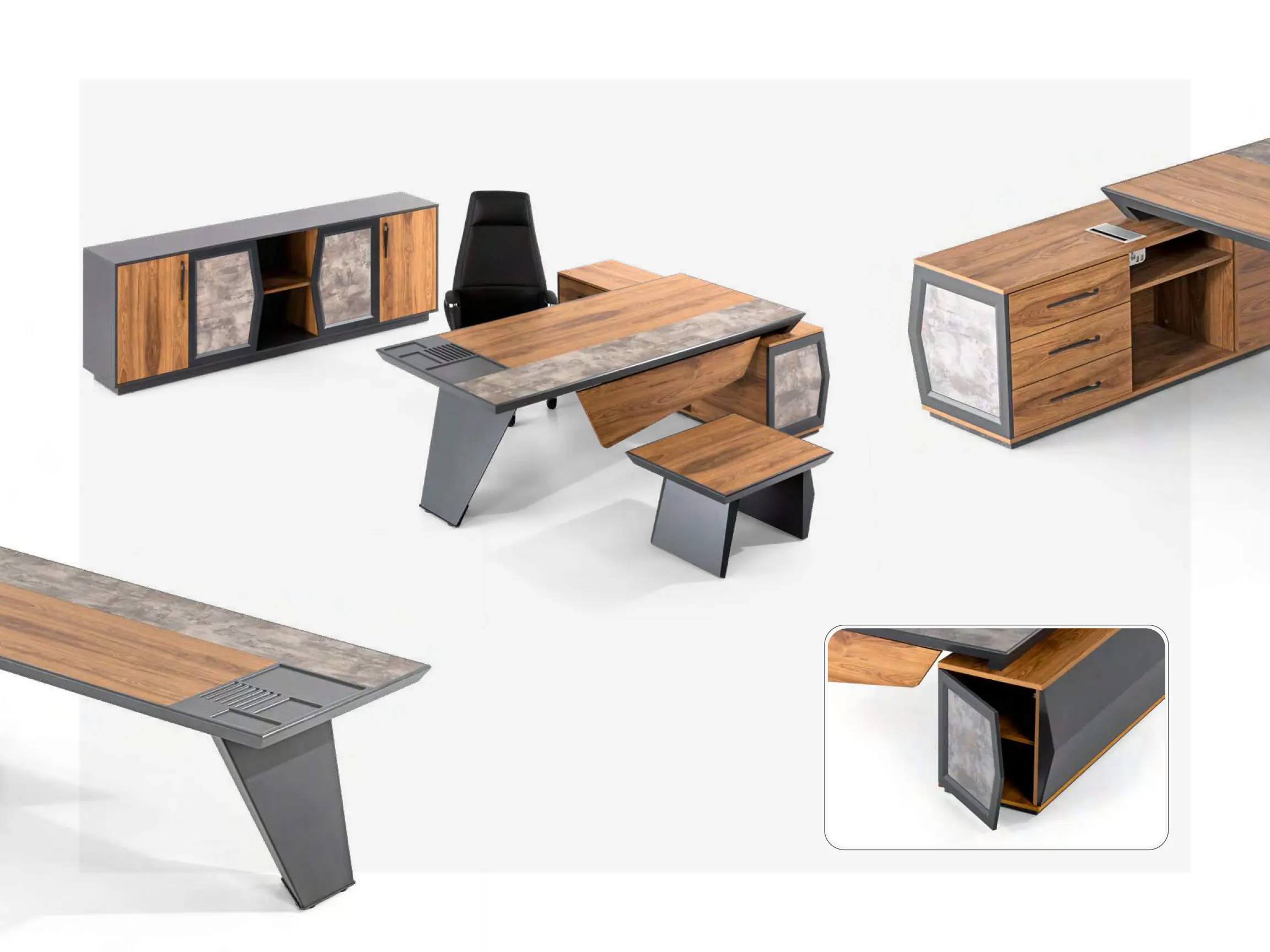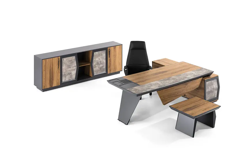 - Дръзко съчетание на дървен материал, метал и каменни детайли