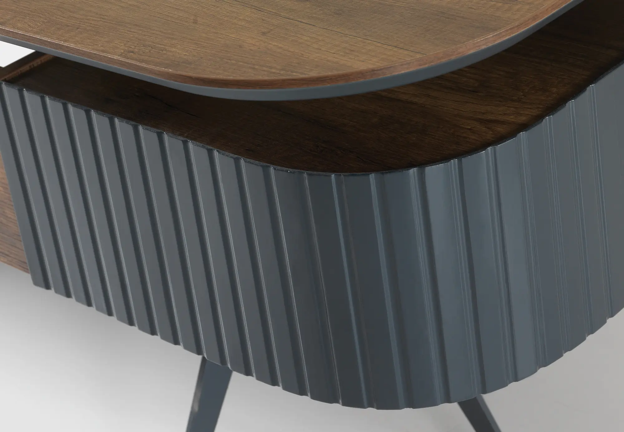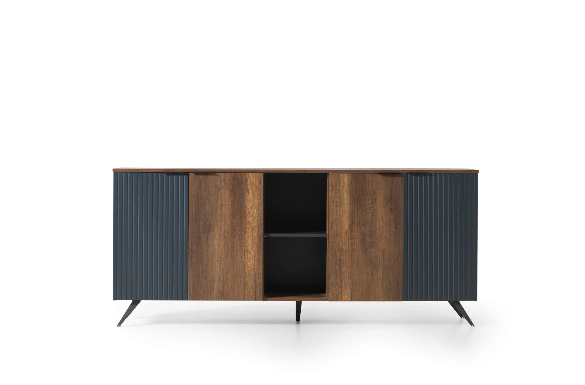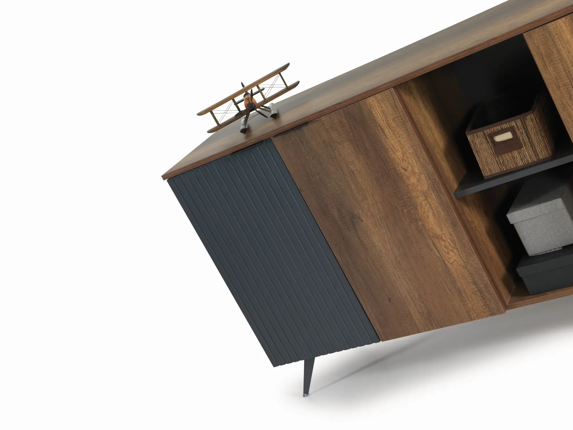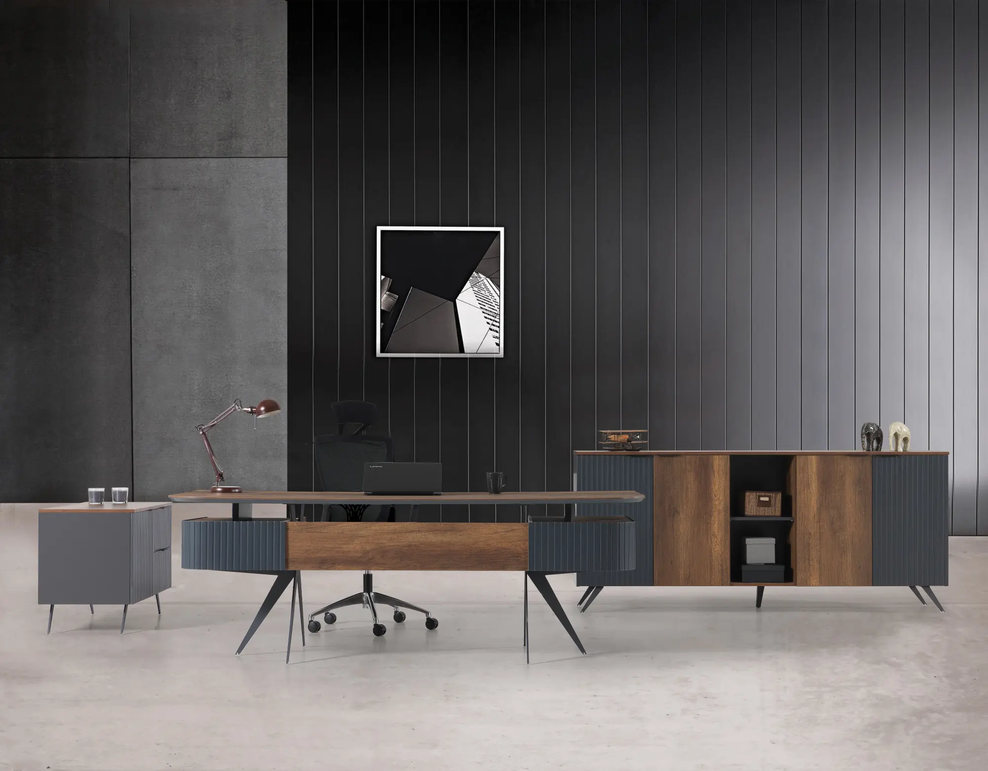 - Дръзко съчетание на дървен материал с тъмни релефни детайли