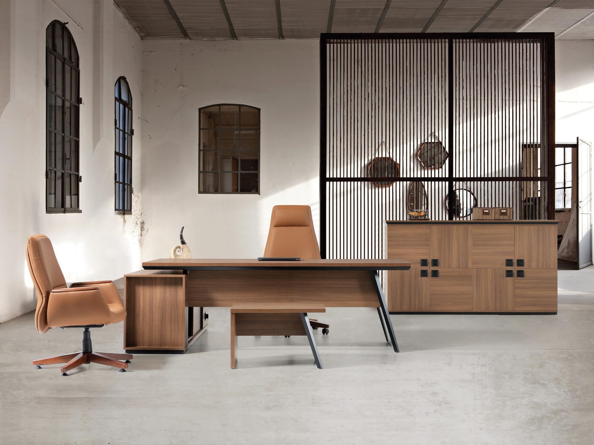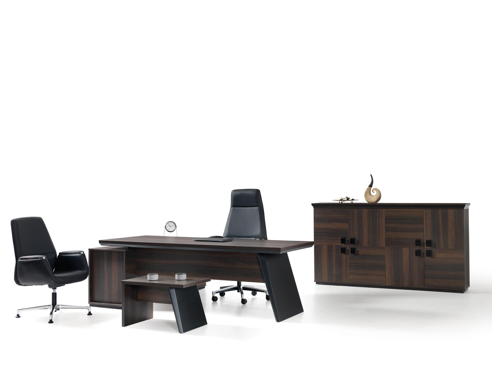 Директорски кабинет MUSTANG е съчетание от небрежни отвесни линии и непрекъснато желание за самоусъвършенстване. Мебелите, част от серията MUSTANG препускат между топлина, удобство и функционалност. Кабинетът се предлага в комбинация от офис бюро със страничен модул, масичка за кафе и офис шкаф.