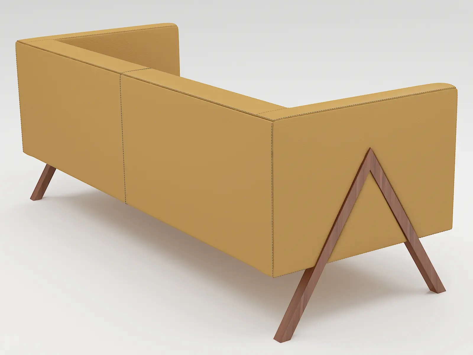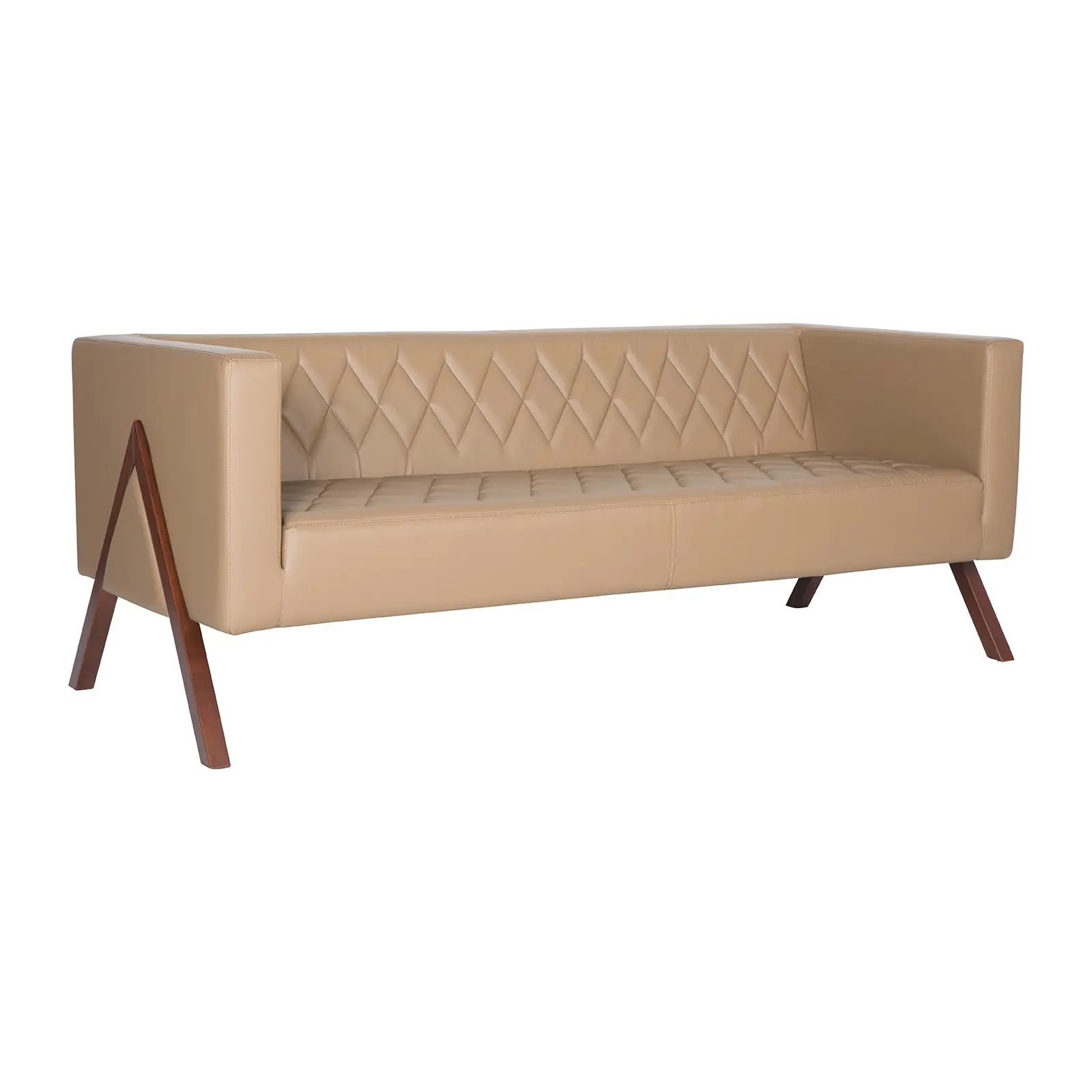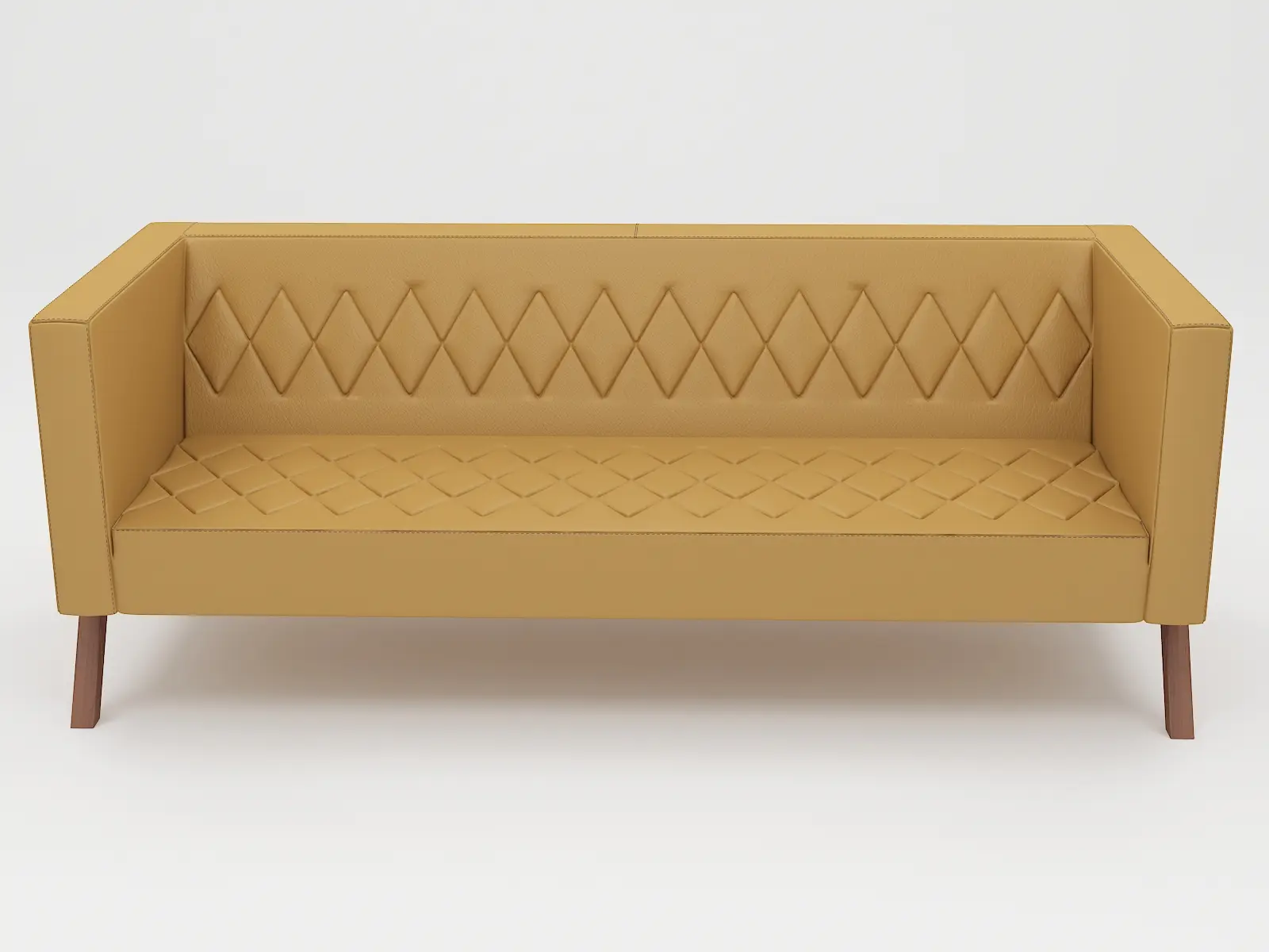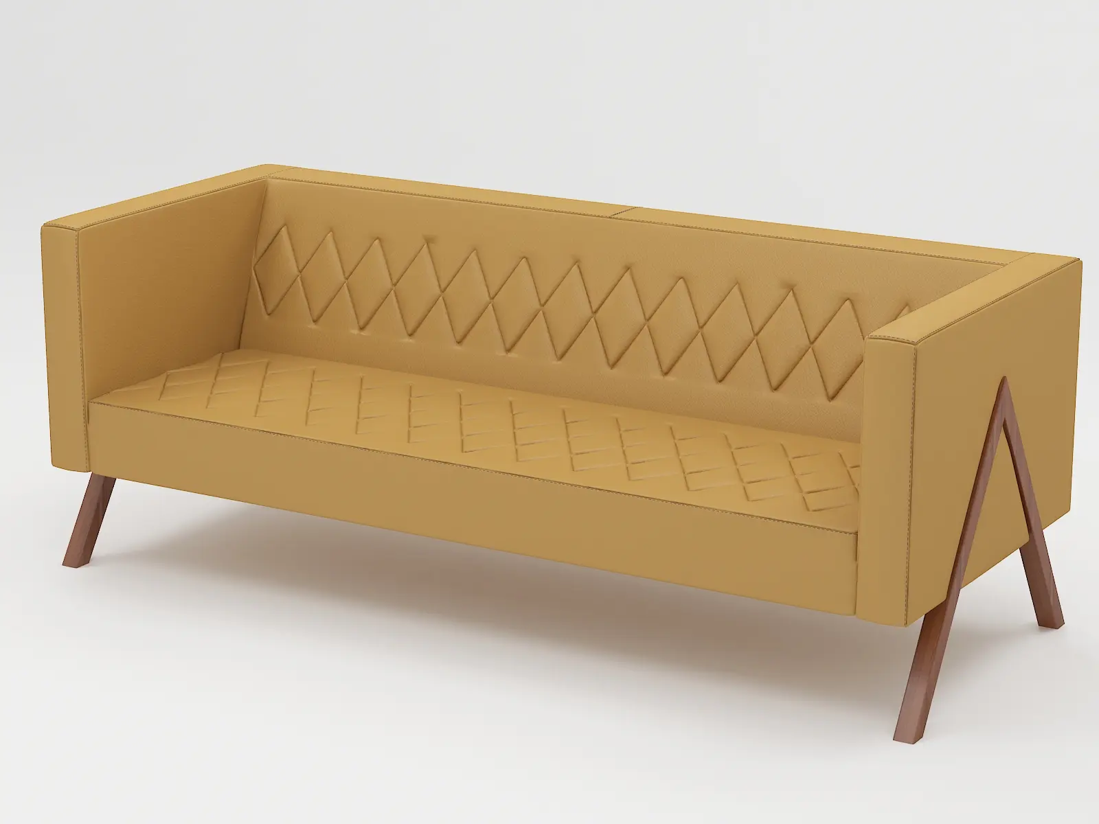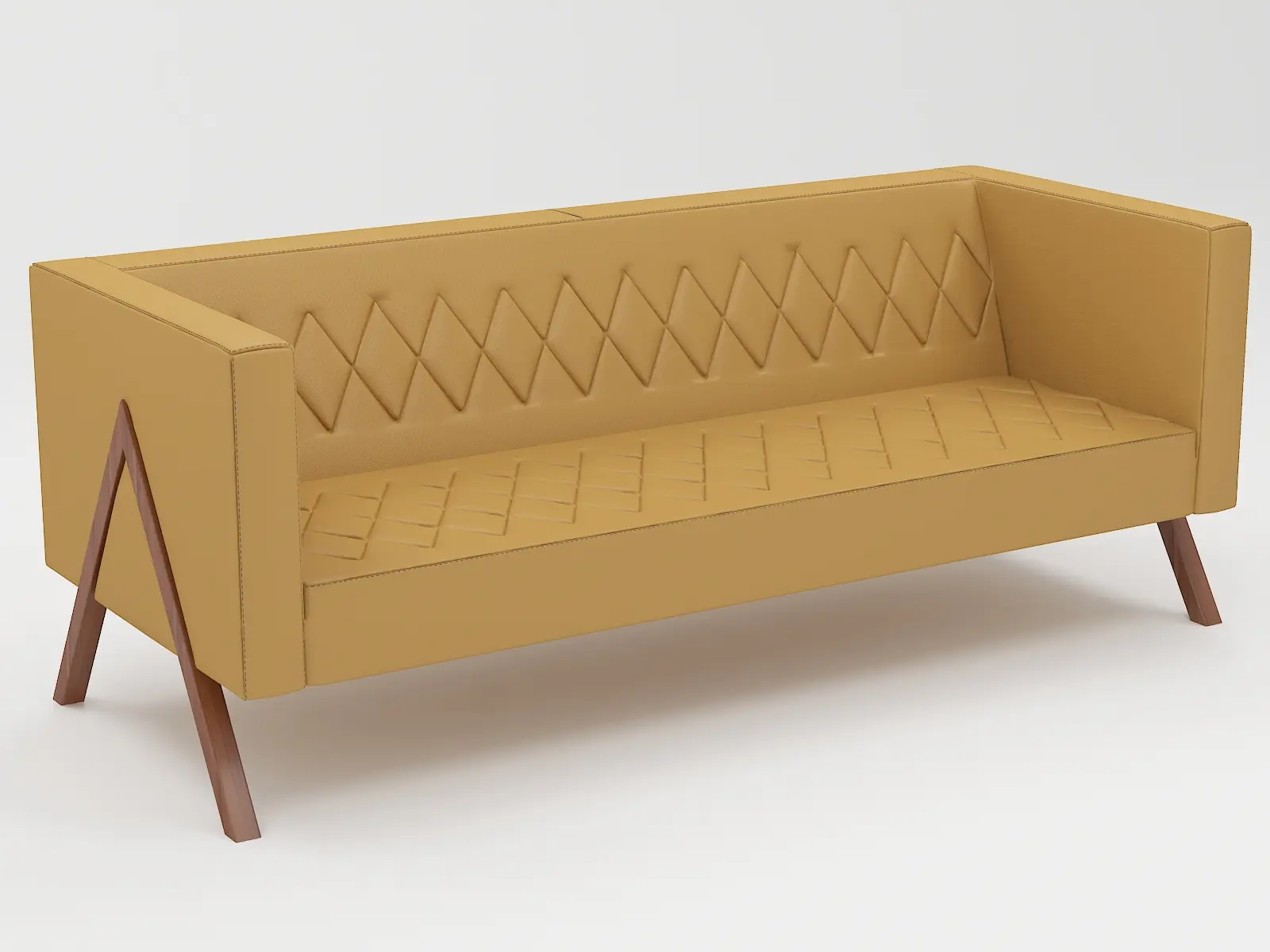 Триместен диван с модерна визия и елегантен дизайн. Малки ромбчета по облегалката, тънки подлакътници и дървени крака. Изработен от полиуретанова пяна, подходящ за всякакви помещения, с възможност за избор на цвят, дамаска или естествена кожа.