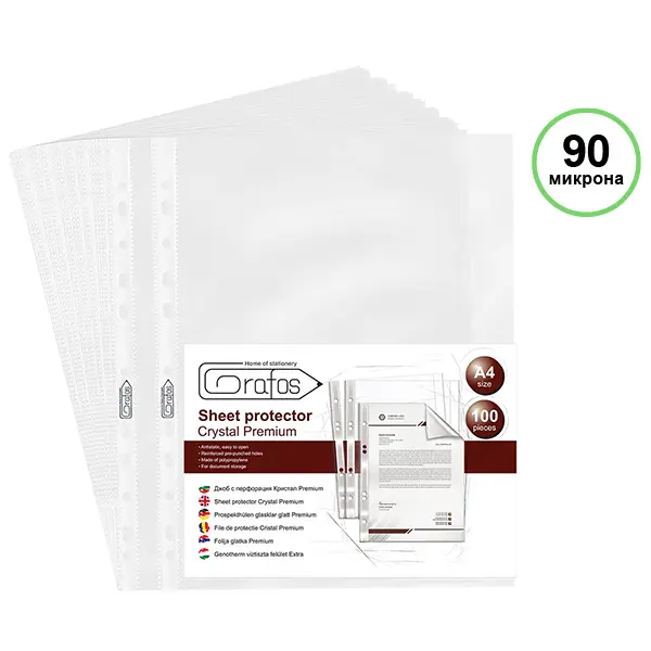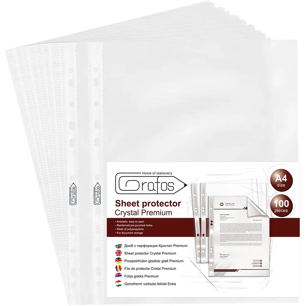 Джобът за документи A4 кристал 90 микр 100 бр е подходящ за всички папки и класьори, защото притежава универсална перфорация.
