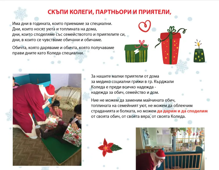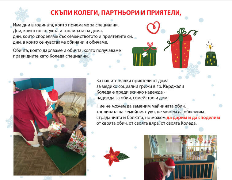 Скъпи колеги, партньори и приятели, има дни в годината, които приемаме за специални. Дни, които носят уюта и топлината на дома; дни, които споделяме със семействотото и приятелите си; дни, в които се чувстваме обичани и обичаме. Обичта, която даряваме и обичта, която получаваме прави дните като Коледа специални.