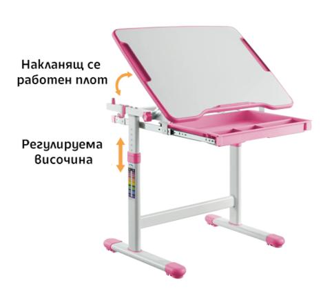 Ергономичният комплект e проектиран, за да осигури удобна учебна среда на всяко дете в процеса на растеж и развитие. Чинът и столът са с регулируема височина за оптимално адаптиране към ръста на детето. Работният плот се накланя до 40 ° правейки го удобен за писане, четене и рисуване.