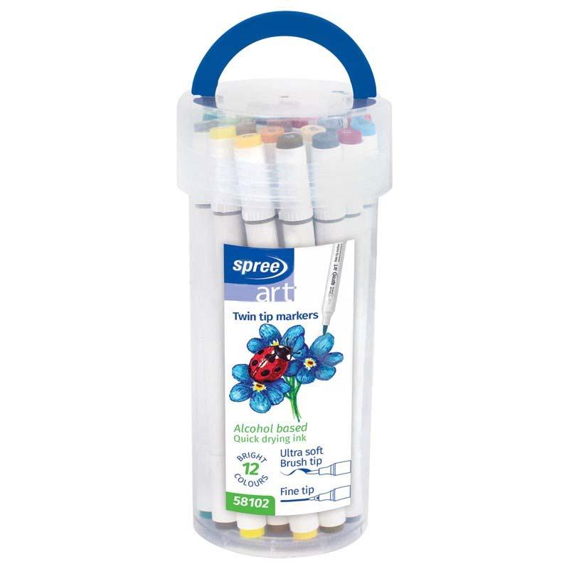 Флумастерите Spree Soft Brush двувърхи е комплект от 12 ярки цвята с олекотено ергономично тяло, ротационно заварена тапа и вентилираща капачка. Ултра мек връх на четката и бързосъхнещо мастило на алкохолна основа.