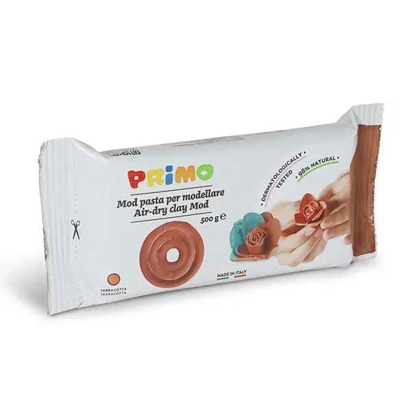 Глината за моделиране 500 гр от серията на Primo за малки деца  е готова за употреба, изсъхва на въздух без да изисква печене, за да се втвърди. Произведена изцяло от растителни съставки, без съдържание на глутен. Подходяща е за ръчна изработка на бижута, коледни украшения, чаши, вази и купи. Изсъхва за около ден, след което може да се оцветява с темперни или акрилни бои. Моделира се лесно с леко влажни ръце, тествана за алергични реакции, подходяща за възраст над 3 години.