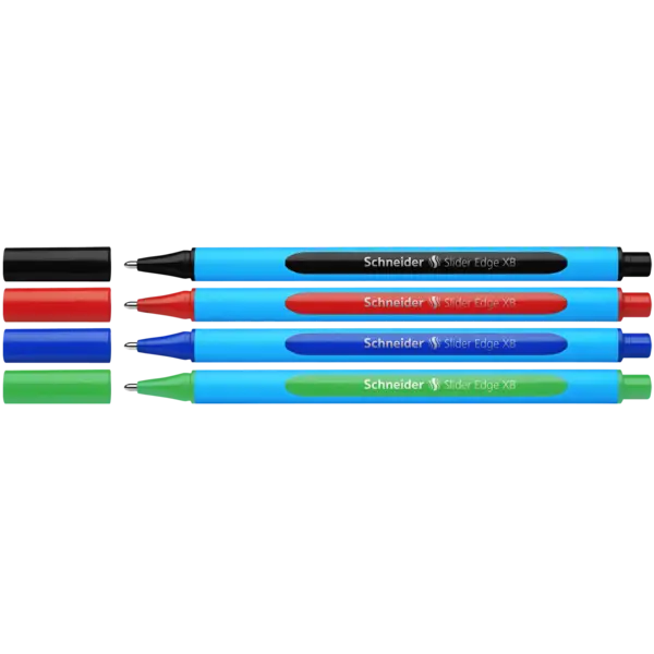 Химикалката Schneider Slider Edge XB е комплект от 4 химикалки- черна, червена, синя и зелена, при които е използвана технологията Viscoglide®, осигуряваща лесно плъзгане при писане. Линията на писане е с допълнителна ширина (XB). Мастилото изсъхва бързо, дори на гладка хартия не пропуска през листа. Химикалките са идеални за писане и рисуване, дори и при лесно попиваща хартия.