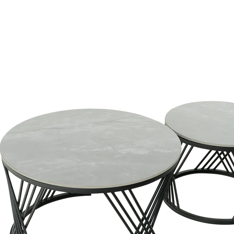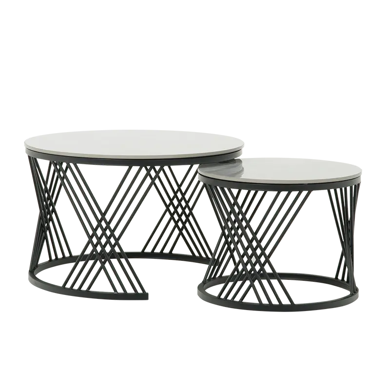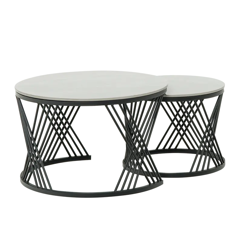 БЕЛОСЛАВА са комплект практични холни масички с интересен дизайн. Те са изработени от керамичен плот и стабилна основа от праховобоядисан метал. Моделът е подходящ за разнообразна употреба и може да бъде използван както като помощна масичка така и за декорация в любимата ви стая.