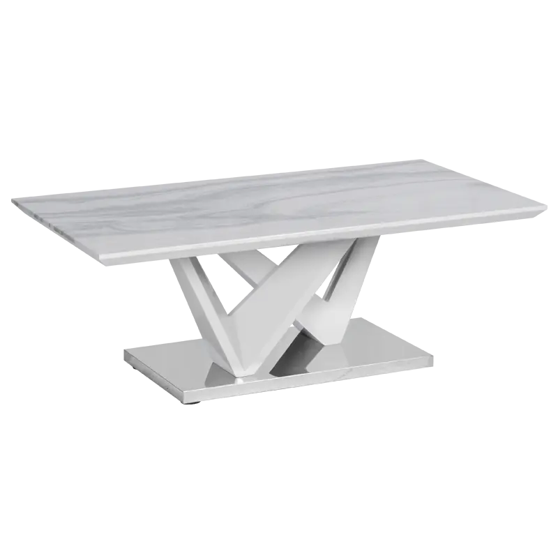 Холна маса ИНДИАНА е модел с разчупена основа и правоъгълен плот с шарка, наподобяваща мрамор. Изработена е от висококачествени материали – МДФ с гланц покритие и неръждаема стомана.