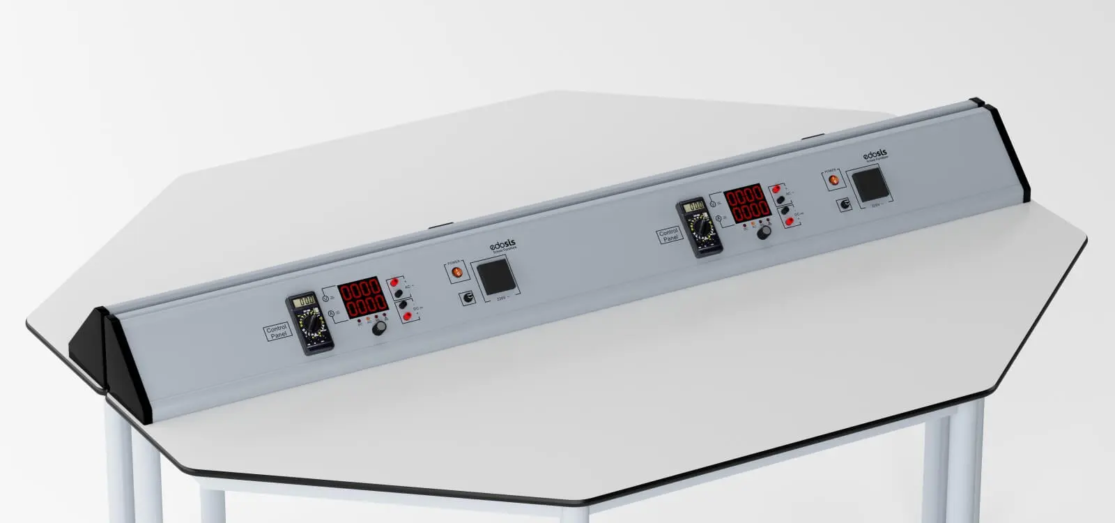 Контролният панел на ученическата маса е изработен от здрав алуминиев корпус. В него са вградени цифров AC/DC захранващ блок, цифров мултиметър и стандартен 220 V контакт, осигуряващи удобство и функционалност при работа.