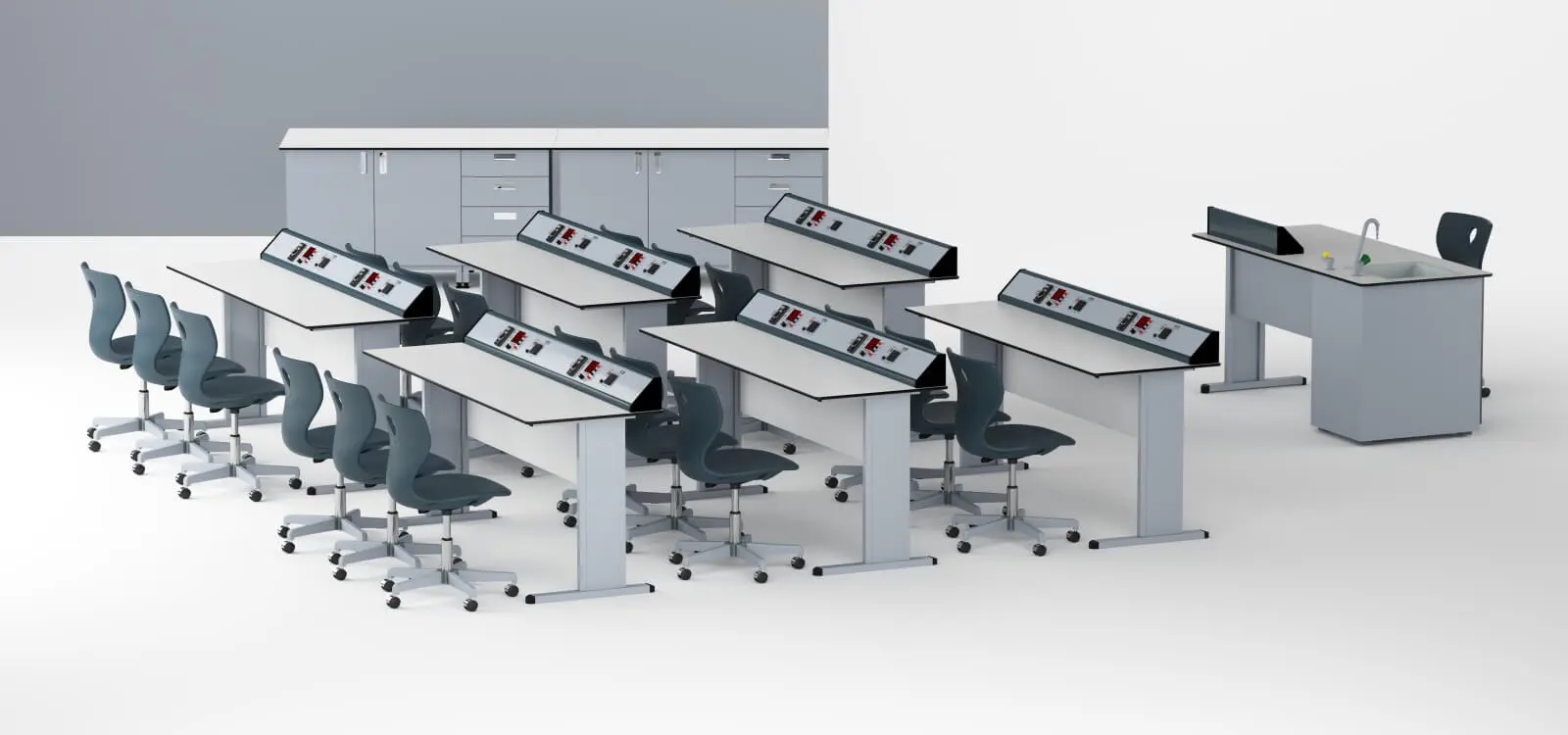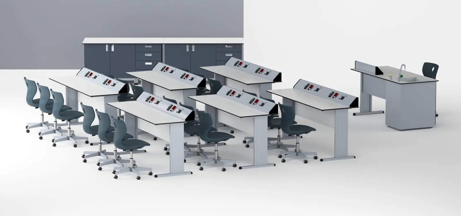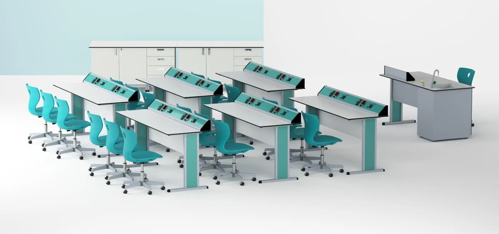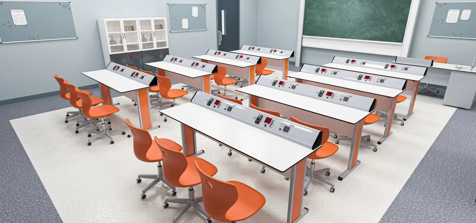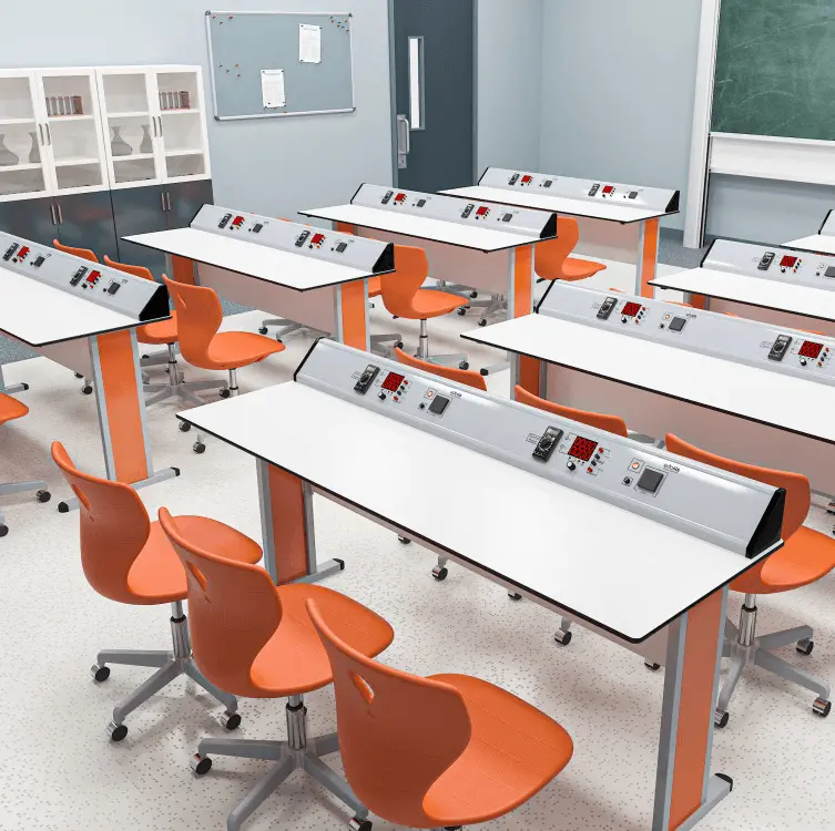 - Всяка експериментална маса може да се управлява индивидуално чрез контролния панел, разположен на учителското бюро