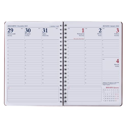 Календар-бележникът ЕЛИТ впечатлява с луксозна корица от термоактивна кожа с декоративни прорези и сребърен топъл печат върху титулната страница. Форматът А4 осигурява много място за записки и планиране, а спиралата и заоблените ъгли гарантират удобство при ежедневна употреба. Идеален за бизнес среда или като стилен корпоративен подарък.