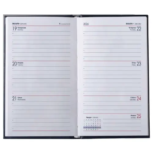 Изключително практичен календар-бележник с размер 90х160 мм, удобен за носене в чанта или джоб. С луксозна твърда корица и топъл печат, той съчетава стил и функционалност. Идеален за бързи бележки и планиране в движение.