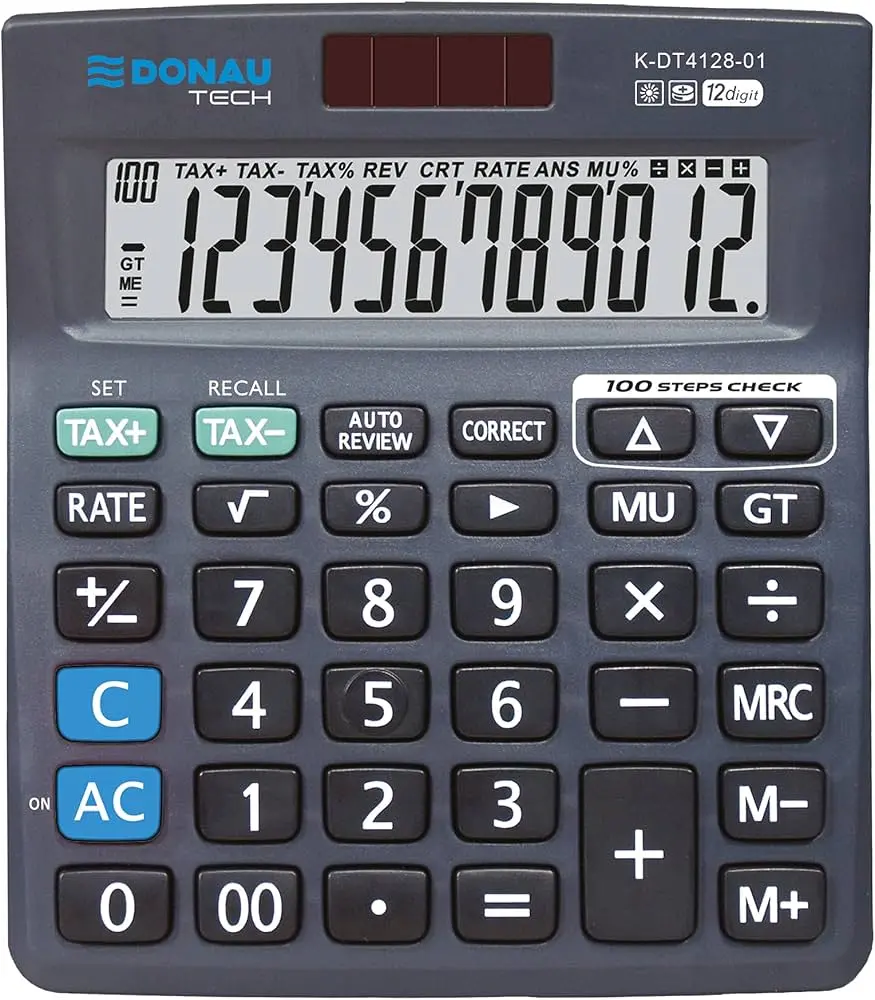 Калкулатор DONAU TECH 4128 12 разряден е практичен и лесен за използване настолен калкулатор, предназначен за ежедневни изчисления в офиса, училище или у дома. С 12-разреден дисплей, той предлага необходимите инструменти за бърза и точна работа.