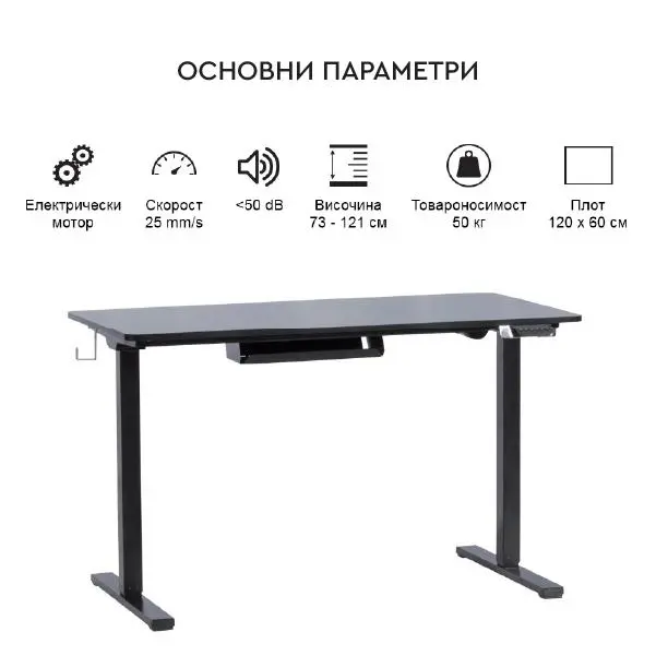 Бюро регулируемо КУКУШ B3 e модел с регулируема височина от 73 до 121 см. С него имате възможност да запаметите до 4 позиции с различна височина. За още по-голямо удобство, моделът разполага със сензор против сблъсък, USB портове, кабелна кошница, както и допълнителни закачалки, на които да поставите удобно чантите си.