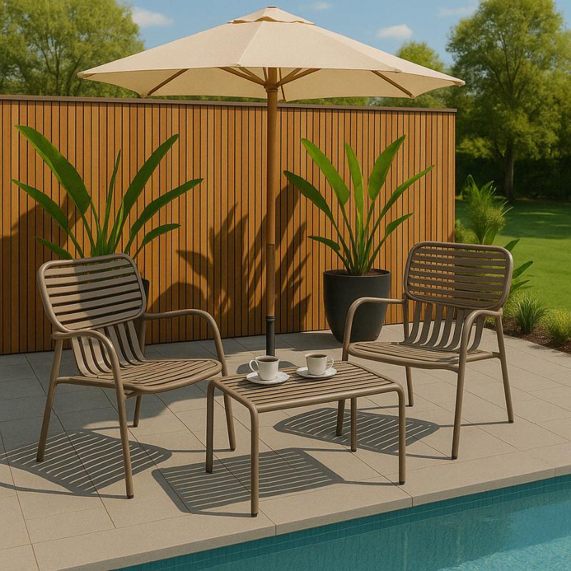 Комплект СИЕЛ включва маса и два стола, изработени от устойчиви на атмосферни условия материали. Масата има здрава метална конструкция, столовете са семпли и изработени от метални ламели с подлакътници. Комплектът съчетава комфорт и елегантен дизайн за приятни моменти на открито.
