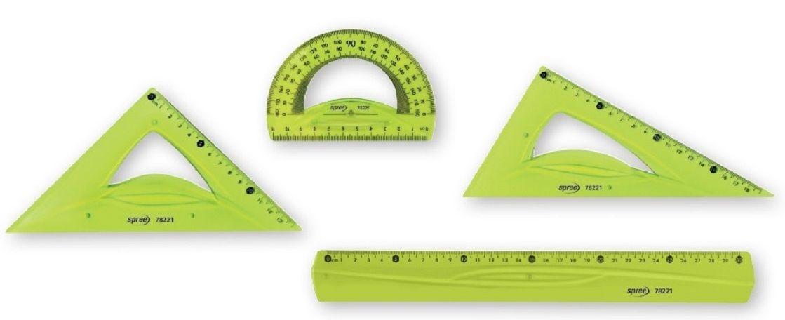 Комплектът от Spree съдържа линия, 2 триъгълника и транспoртир и е чудесен помощник в часовете по геометрия. Изработени са от гъвкави материали, което гарантира целостта им в ученическата раница.