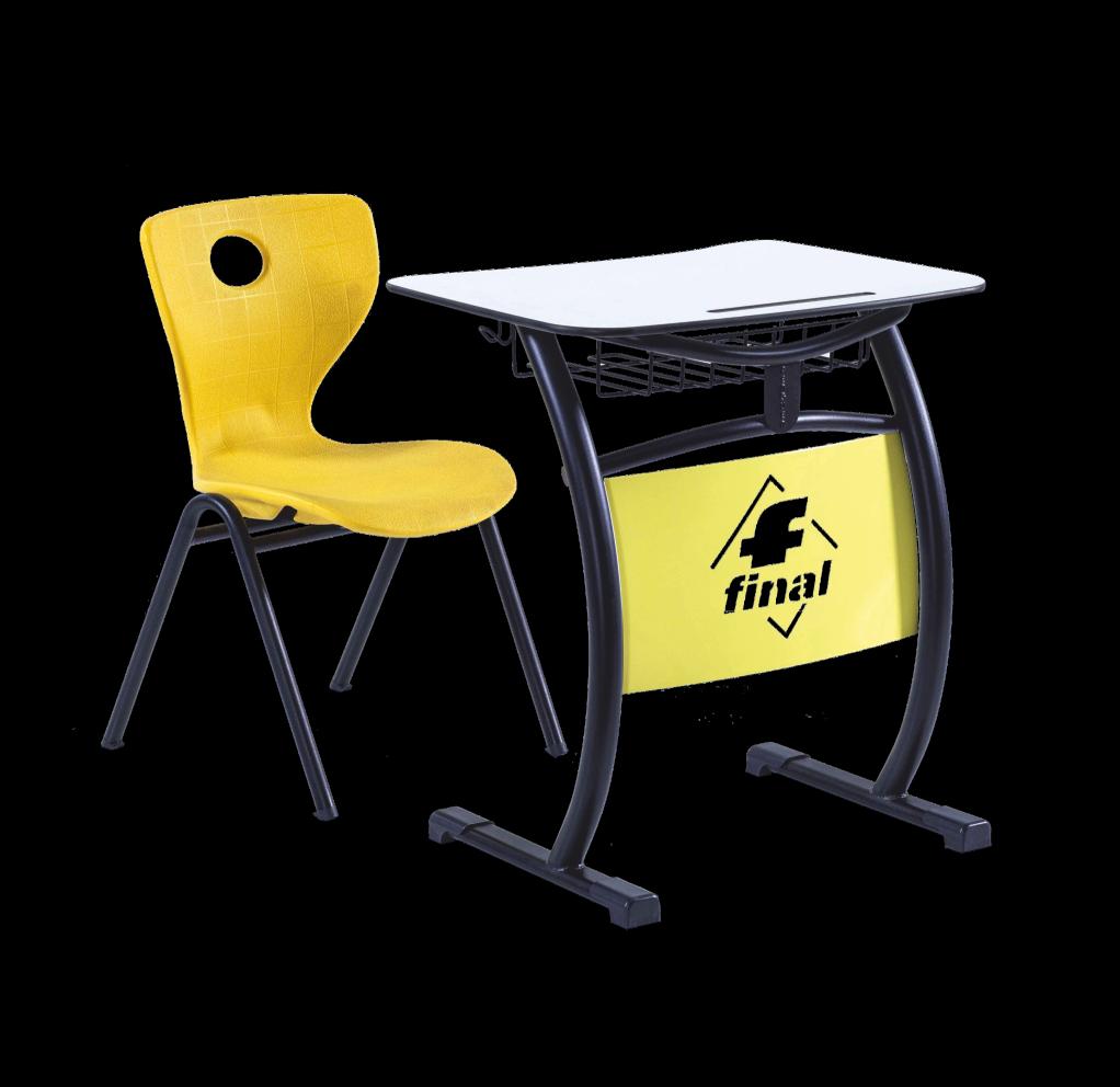 Масата е изработена от компакт ламинат с размери 50х70 см. Бюрото разполага с улей на плота за пишещи пособия и метален рафт за съхранение на учебни пособия. Към комплекта има и стол от полипропилен, праховобоядисан в цвят по избор. Серията предлага възможност за гравира на логото на училището върху предният панел на масата.