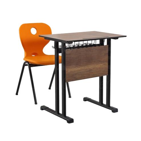 Масата е изработена от компакт ламинат с размери 50х70 см. Бюрото разполага с улей на плота за пишещи пособия и метален рафт за съхранение на учебни пособия. Към комплекта има и стол от полипропилен, праховобоядисан в цвят по избор.