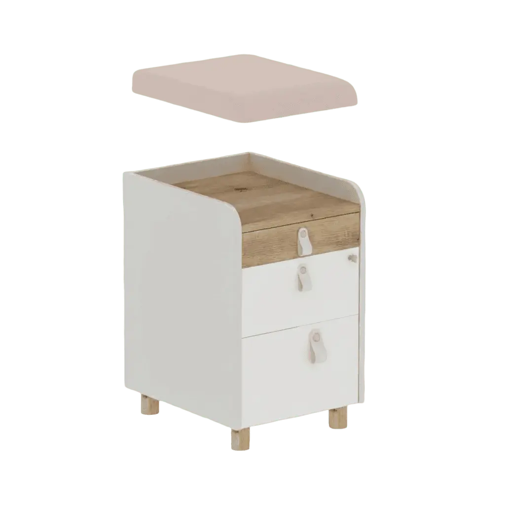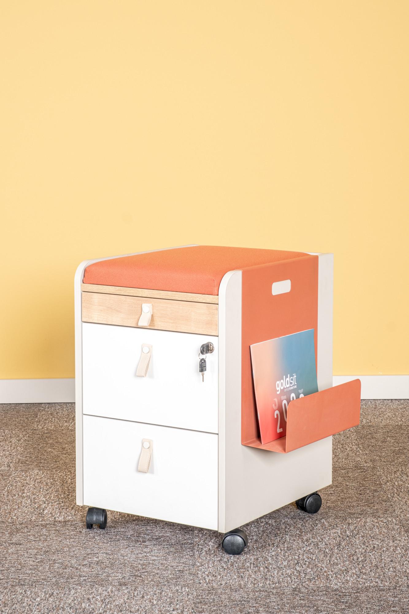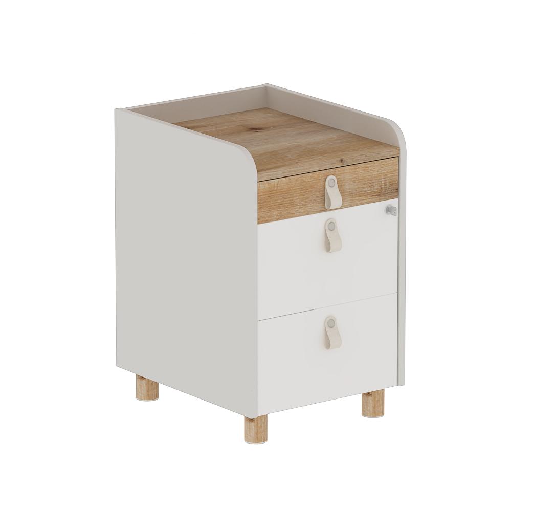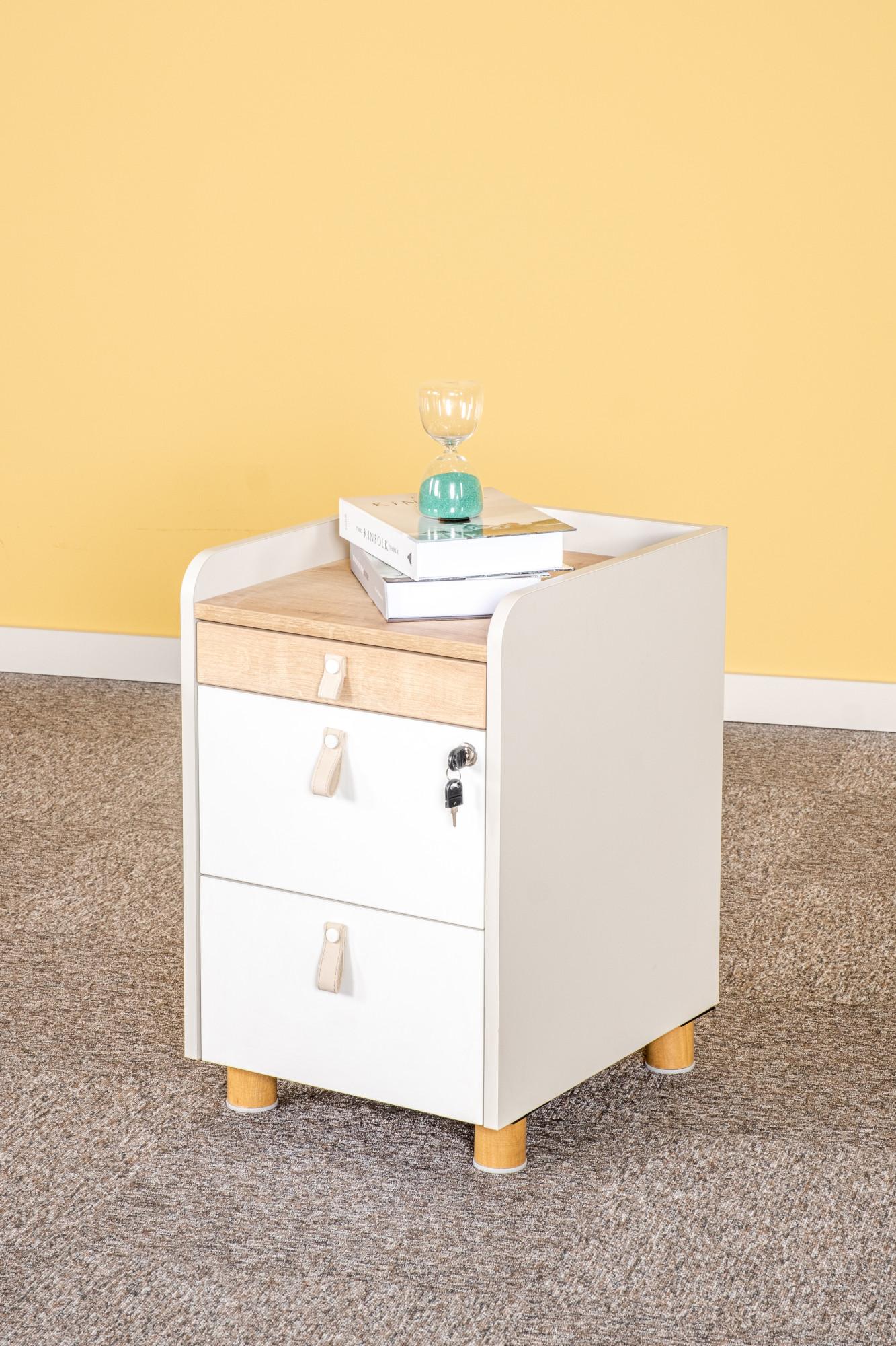 Контейнерът за офис бюро е изработен от ПДЧ материал с меламиново покритие с дебелина на плоскостта от 18 мм. Разполага с три чекмеджета със заключване и е подходящ е за съхранение на документи и лични вещи.