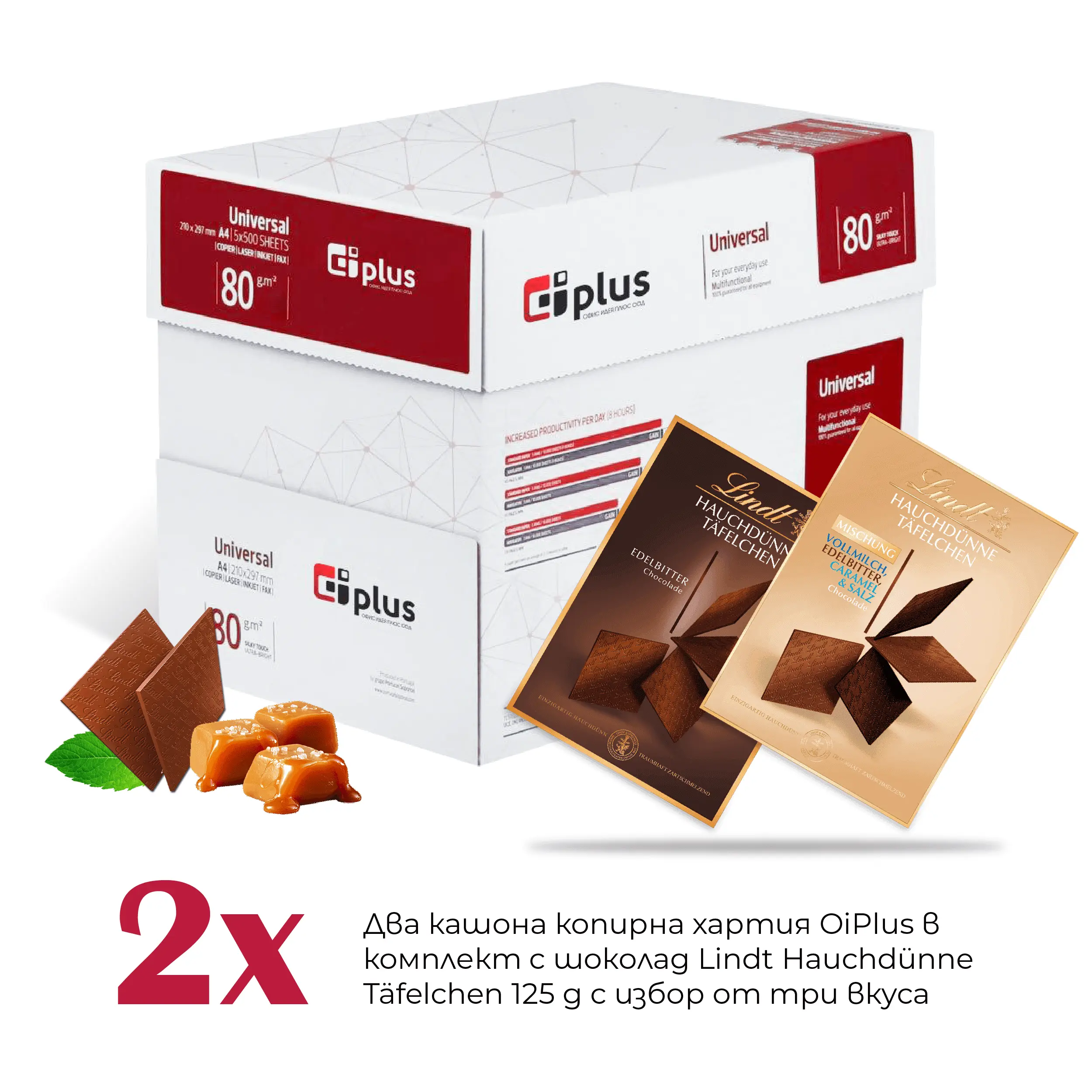 Вземете два кашона хартия OIP в КОМПЛЕКТ с шоколад Lindt Hauchdünne Täfelchen 125 g. Насладете се на фината елегантност на ултратънките шоколадови плочки Lindt, създадени да се разтапят нежно в устата и да доставят истинско удоволствие за сетивата.